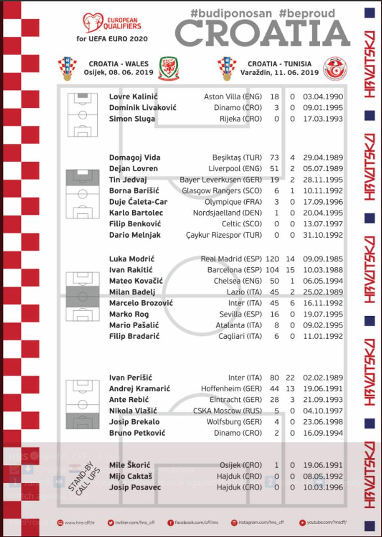 Hrvatski izbornik Zlatko Dalić objavio je popis reprezentativaca za nadolazeći eurokvalifikacijski susret protiv Walesa u Osijeku 8. lipnja, kao i prijateljsku utakmicu protiv Tunisa u Varaždinu, 11. lipnja ove godine.