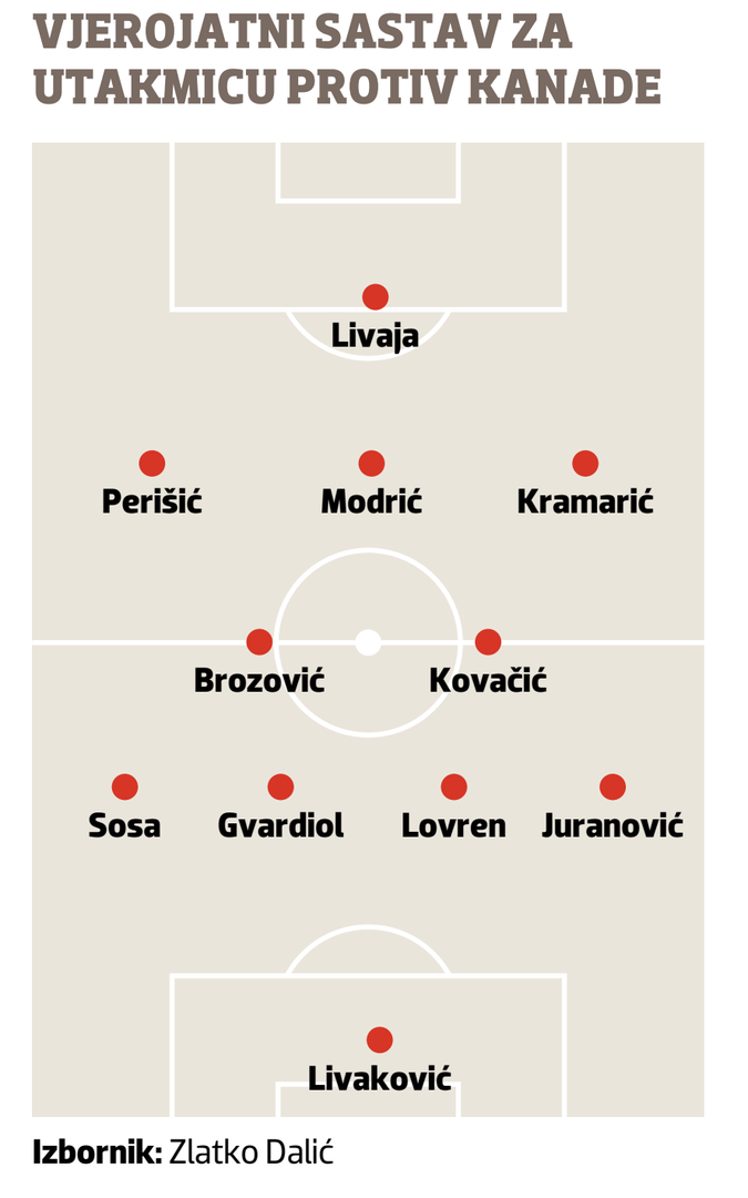 - Dalićevih vjerojatnih 11: Livaković - Juranović, Gvardiol, Lovren, Sosa - Modrić, Brozović, Kovačić - Kramarić, Livaja, Perišić.
