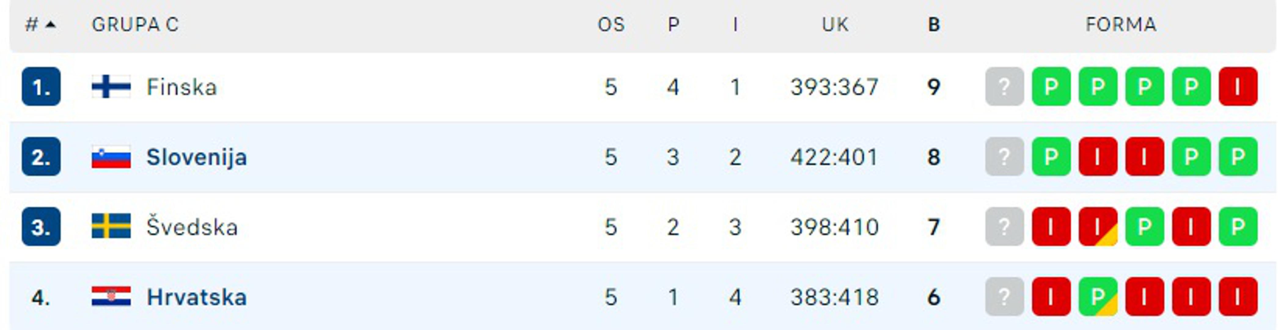 Posljednje kolo prvoga kruga igrat će se u nedjelju kada će Hrvatska u Rijeci ugostiti Finsku te joj je potrebna pobjeda uz domaći poraz Švedske od Slovenije kako bi izbjegla posljednje mjesto u skupini koje ujedno znači i zavšetak kvalifikacija.