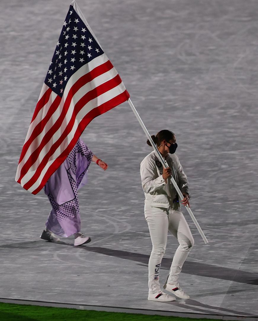 Tokyo 2020 Olympics - The Tokyo 2020 Olympics Closing Ceremony Tokyo 2020 Olympics - The Tokyo 2020 Olympics Closing Ceremony - Olympic Stadium, Tokyo, Japan - August 8, 2021. Flag bearer Kara Winger of the United States participates in the closing ceremony REUTERS/Amr Abdallah Dalsh AMR ABDALLAH DALSH