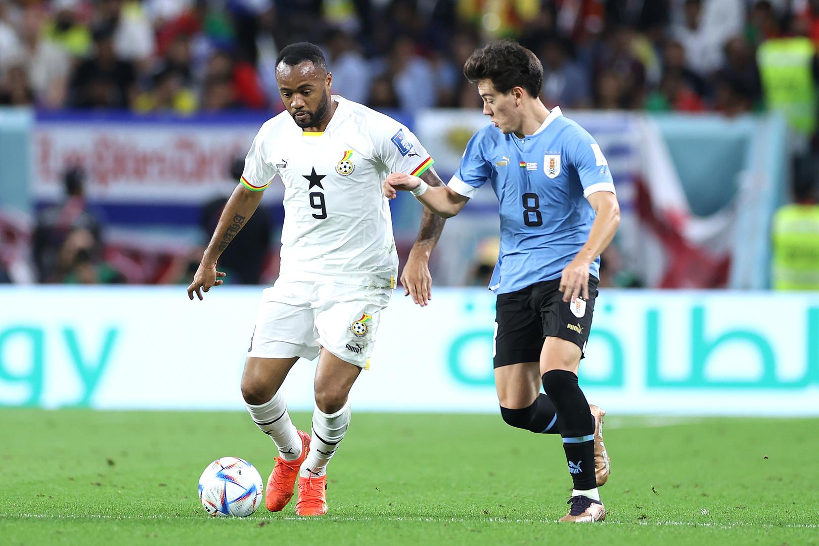 Jordan Ayew of Ghana is challenged by Facundo Pellistri of Uruguay during the 2022 FIFA World Cup match between Ghana and Uruguay held at Al Janoub Stadium in Al Wakrah, Qatar on 2 December 2022 © Alain Guy Suffo/Sports Inc Photo: Backpagepix/PRESS ASSOCIATION