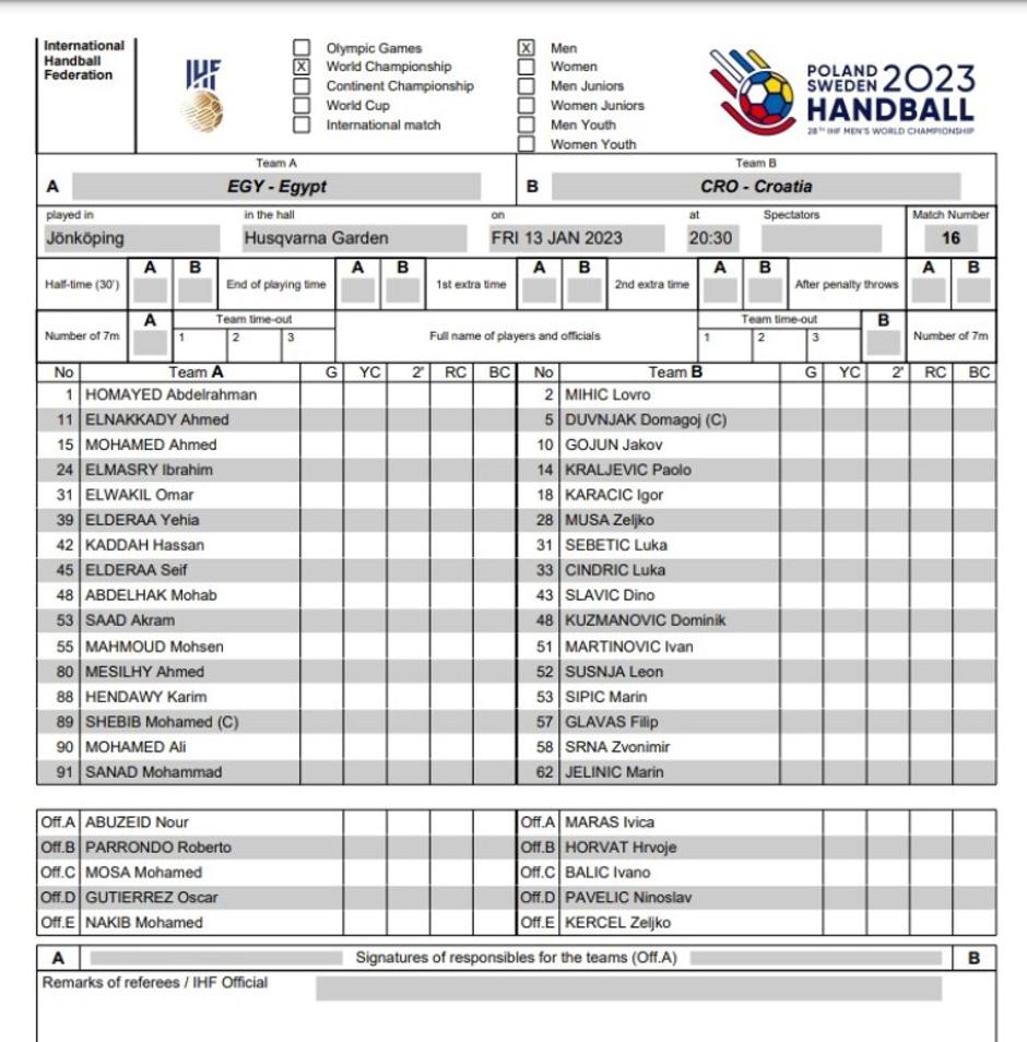 Kod Egipćana je sa sedam pogodaka prednjačio Mohsen Mahmoud, a po pet golova postigli su Yehia Elderaa i Ali Mohamed. U nedjelju (20.30 sati) će hrvatski rukometaši igrati utakmicu drugog kola protiv reprezentacije SAD-a. U skupini su još Maroko i SAD, a u drugi krug idu prve tri reprezentacije dok četvrta razigrava za plasman.