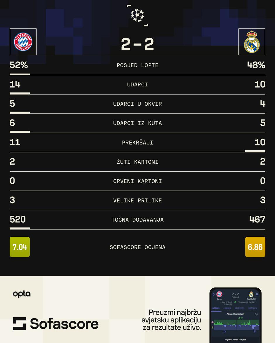 Na minhenskoj Allianz Areni nogometaši Bayerna i madridskog Reala su odigrali prvu polufinalnu utakmicu Lige prvaka, pobjednika nije bilo nakon 2-2 (0-1) tijekom 90 minuta igre te se drama seli na uzvrat i madridski Santiago Bernabeu.