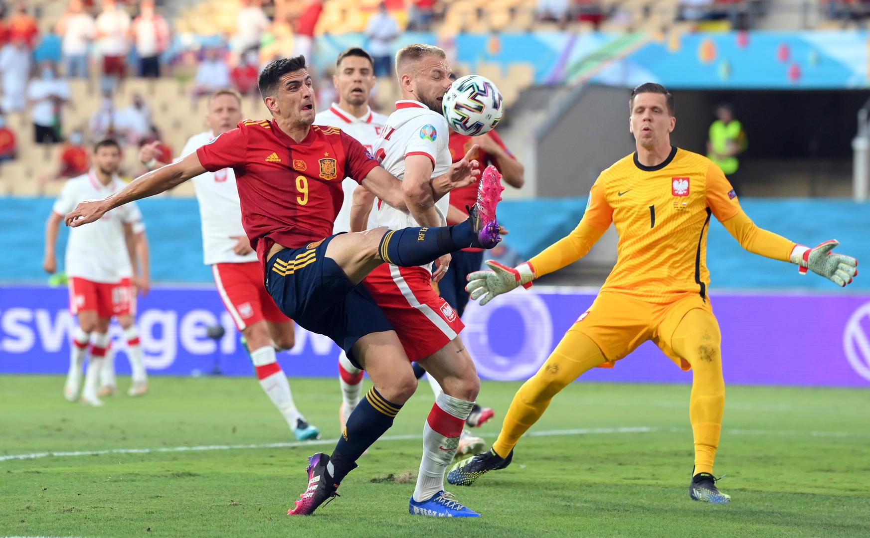 Euro 2020 - Group E - Spain v Poland Soccer Football - Euro 2020 - Group E - Spain v Poland - La Cartuja Stadium, Seville, Spain - June 19, 2021 Spain's Gerard Moreno in action with Poland's Tymoteusz Puchacz and Wojciech Szczesny Pool via REUTERS/David Ramos DAVID RAMOS