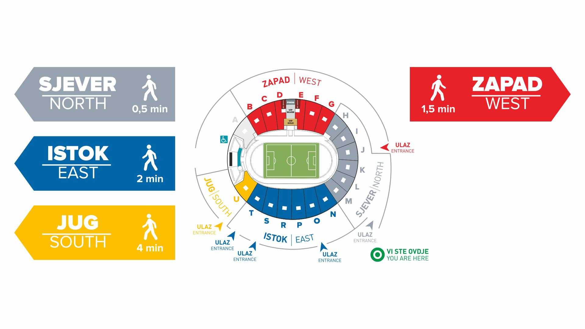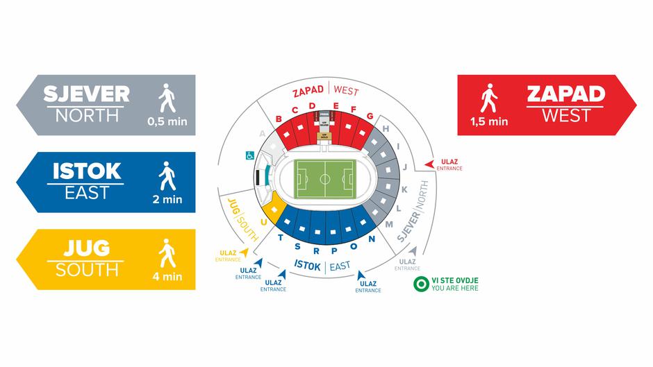 Ulazak za Zapad: Posjetitelje koji posjeduju ulaznicu za zapadnu tribinu, kontrola ulaznica i gledatelja obavljat će se na pristupu sa Zrinsko-frankopanske ulice (ulaz sa sjeverne strane), pored bazena