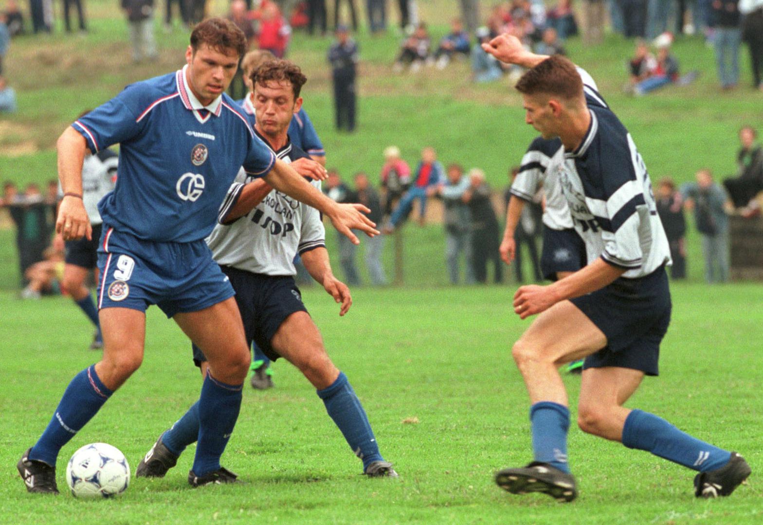 08.09.1998., Dugo Selo, Zagreb - U utakmici 1/16 finala Hrvatskog kupa Dugo Selo je eliminiralo Croatiju Zagreb iz daljnjeg natjecanja rezultatom 3:2. Modri su u poveli 0:2 golovima Viduke (17) i Sokote (45), ali u drugom dijelu Benkoci (48), Rukavina (autogol, 75) i Car (88) dovode domacine u vodstvo. U posljednjim trenucima utakmice nakon prekrsaja nad Rukavinom dosudjen je jedanaesterac za Croatiju, ali domaci vratar Igor Istvanic obranio je udarac Joska Jelicica. Mislite da je Croatia igrala sa drugim sastavom? Prosudite sami: Butina (Vasilj, 46), Rukavina, Mladinic, Tokic, Saric, Jelicic, Biscan (Banovic, 56), Sokota (J. Simic, 80), Cvitanovic, Mikic, Viduka. Mark Viduka. r"nPhoto: Zeljko Hladika/Vecernji listr"n