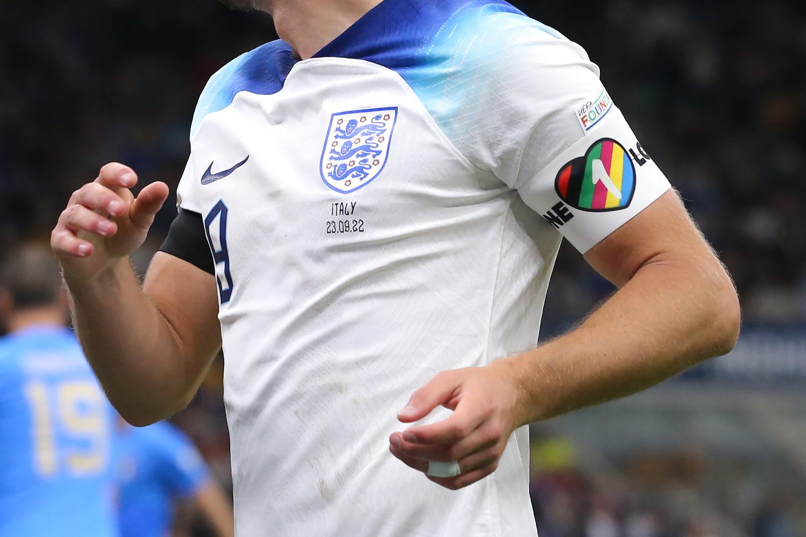 September 23, 2022, Milan, United Kingdom: Milan, Italy, 23rd September 2022. Details of the One Love LGBT captain's armband worn by Harry Kane of England during the UEFA Nations League match at Stadio Giuseppe Meazza, Milan. Photo via Newscom Photo: Jonathan Moscrop/NEWSCOM
