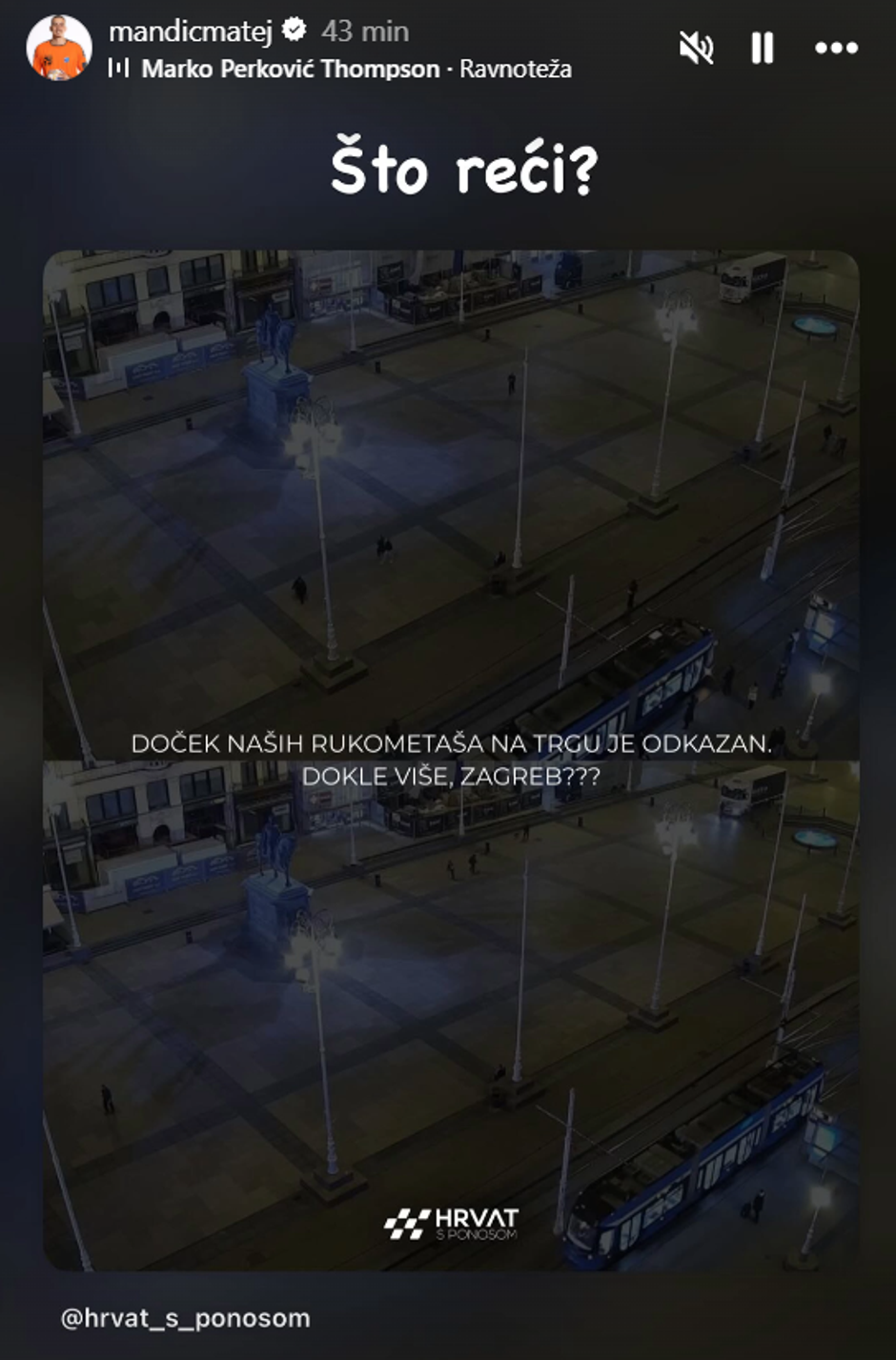 Umjesto slavljeničke euforije na Trgu bana Jelačića, hrvatska javnost svjedočila je priopćenju Hrvatskog rukometnog saveza koje je potvrdilo ono čega su se mnogi pribojavali: svečani doček brončanih rukometaša je otkazan. Kamen spoticanja, kako je i službeno potvrđeno, bio je glazbeni program. Dok su igrači i stručni stožer, poneseni velikim uspjehom, izrazili jednoglasnu želju da im na pozornici zapjeva Marko Perković Thompson, s kojim su se čuli i videopozivom iz svlačionice, gradska uprava na čelu s Tomislavom Tomaševićem takav prijedlog nije prihvatila.