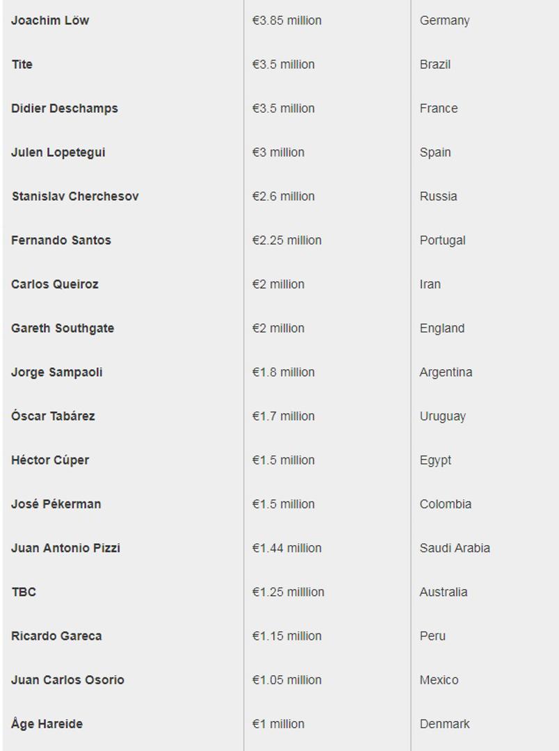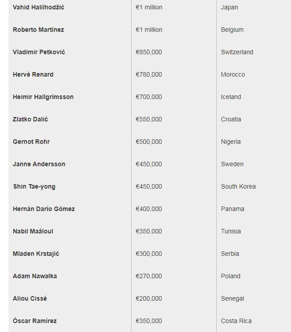 Na posljednje tri pozicije nalaze se izbornik Srbije (300 tisuća), Poljske (270 tisuća) te Senegala (200 tisuća). Na prošlom SP-u apsolutni rekorder bio je Fabio Capello koji je tada godišnje dobivao oko 9 milijuna eura...
