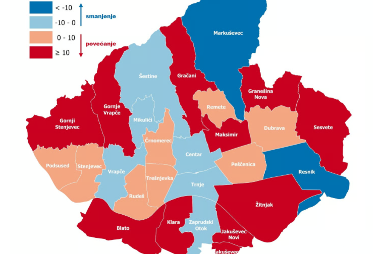 NAJNOVIJE ISTRAŽIVANJE Nova karta zagrebačkih kvartova prikazuje veliki dio grada u crvenom, razlog će vas iznenaditi Analiza promjena medijalne veličine prodanih stanova u razdoblju od 2018. do 2023. godine pokazuje da je u većini dijelova grada došlo do promjena do 10 %