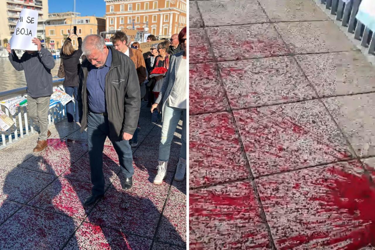 30 NAPETO U ZADRU FOTO/VIDEO Dvojica maskiranih s čamca zasula povorku crvenom bojom, policija privela jednog sudionika nereda U jednom je trenutku došlo do naguravanja s policijom te je prema muškarcu koji je počeo razbijati čaše upotrijebljena sila
