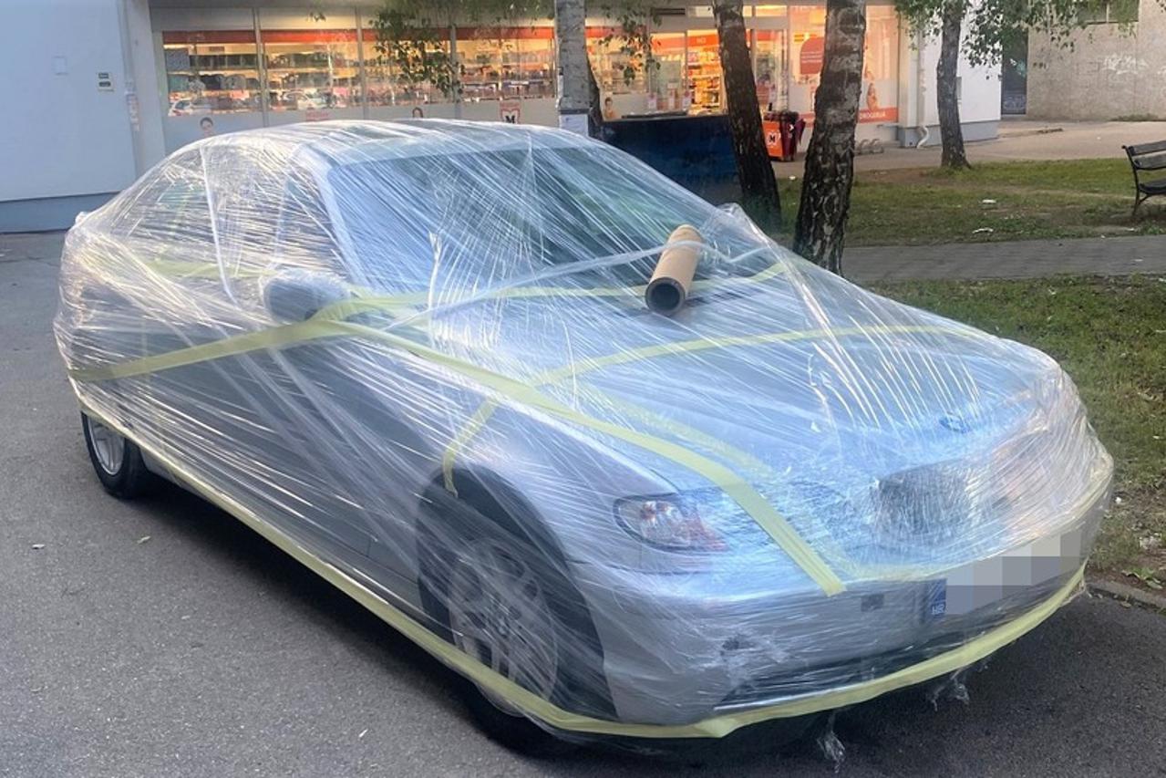 3 imao je što vidjeti Gimnazijalci iz šale omotali kolegi automobil u foliju Dok je neobična instalacija privlačila pozornost prolaznika, uskoro se pojavio i vlasnik omotanog 'limenog ljubimca'