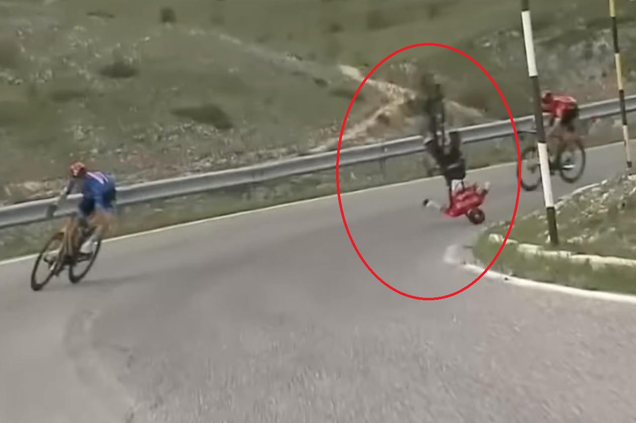 2 GIRO D'ITALIA VIDEO Teška nesreća slovenskog biciklista: Izgubio kontrolu i pao na glavu Pao je na glavu nakon neopreznog ulaska u lijevi zavoj tijekom devete etape. Pritom je udario u rubnjak i preletio preko prednjeg dijela bicikla pa podosta teško udario u asfalt.