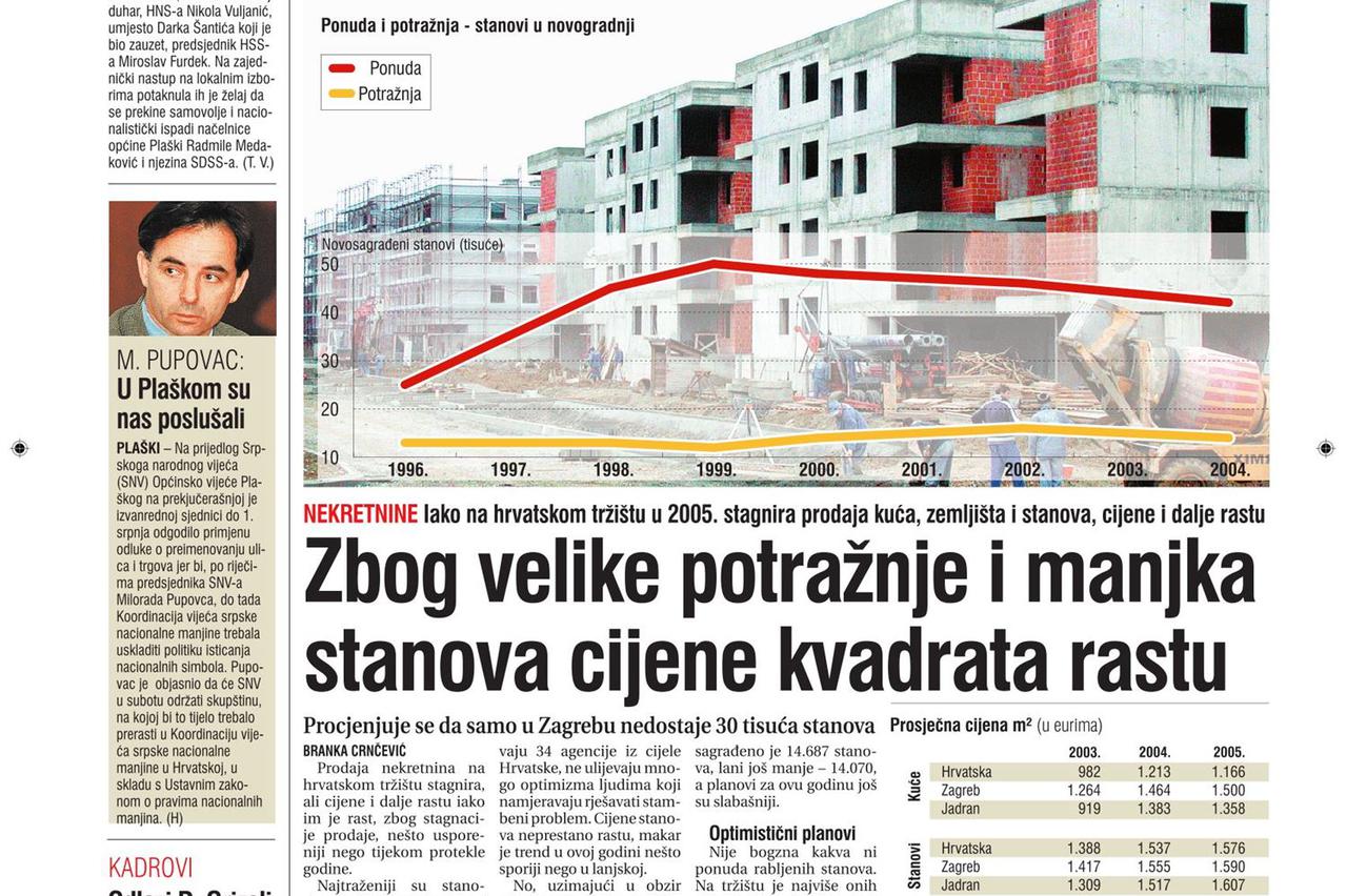 Članak iz Večernjakove arhive, objavljen 2005., ukazivao je na problem - kronično malu ponudu i veliku potražnju. Samo u gradu Zagrebu, 2005., nedostajalo je oko 30 000 stanova, a oni u novogradnji prodavali su se još u fazi nacrta. Taj problem ni do danas nije riješen