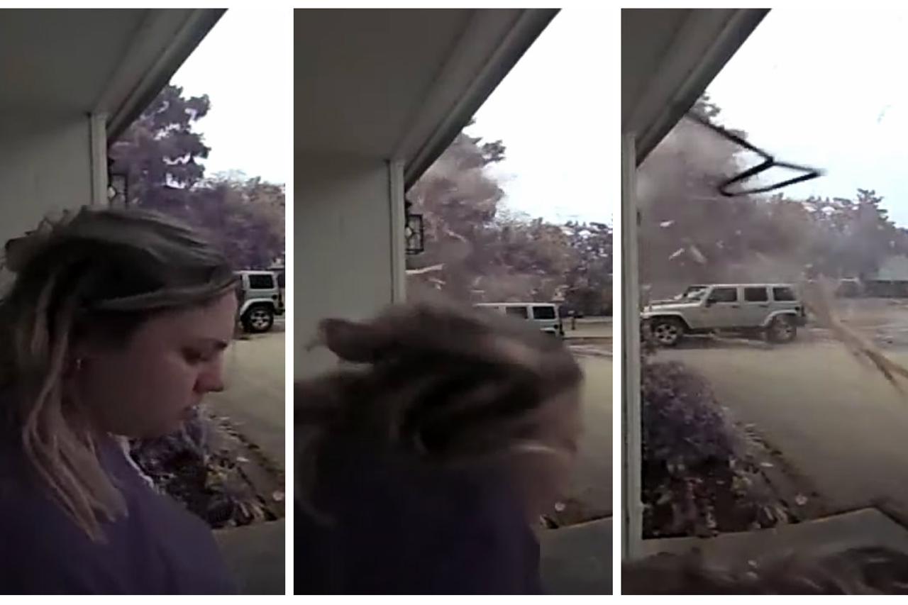 OŠTEĆENE KUĆE VIDEO Izašla iz kuće i skoro teško stradala: Grom udario u stablo, komadići letjeli po ulici Na snimci se može vidjeti kako su komadići stabla letjeli po četvrti, a Sarah je iste sekunde pobjegla u kuću.