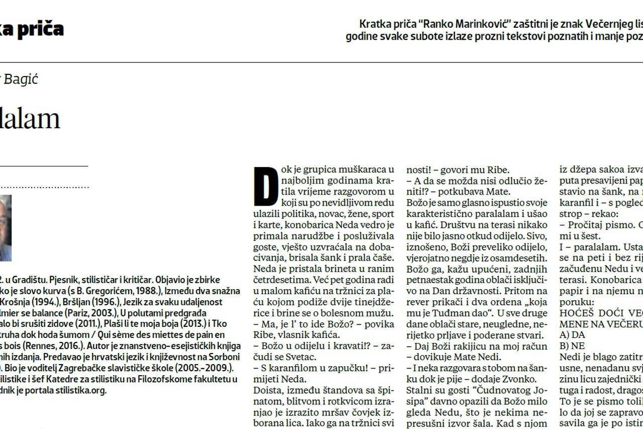 KRATKA PRIČA Paralalam Kratka priča "Ranko Marinković" zaštitni je znak Večernjeg lista. Od 1964. godine svake subote izlaze prozni tekstovi poznatih i manje poznatih autora