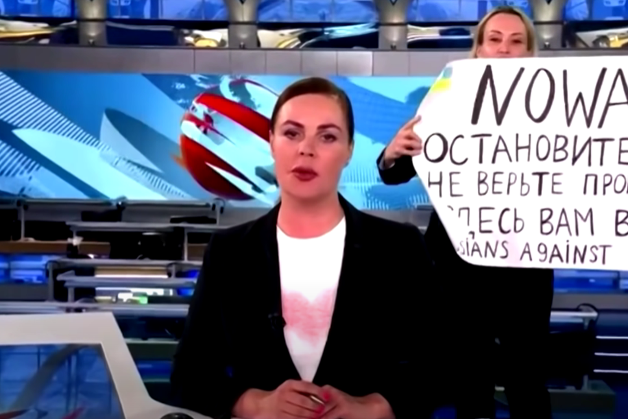 Ovsjanikova je tijekom emitiranja vijesti na državnoj televiziji prosvjedovala protiv rata držeći transparent na kojem je pisalo: "Ne ratu"