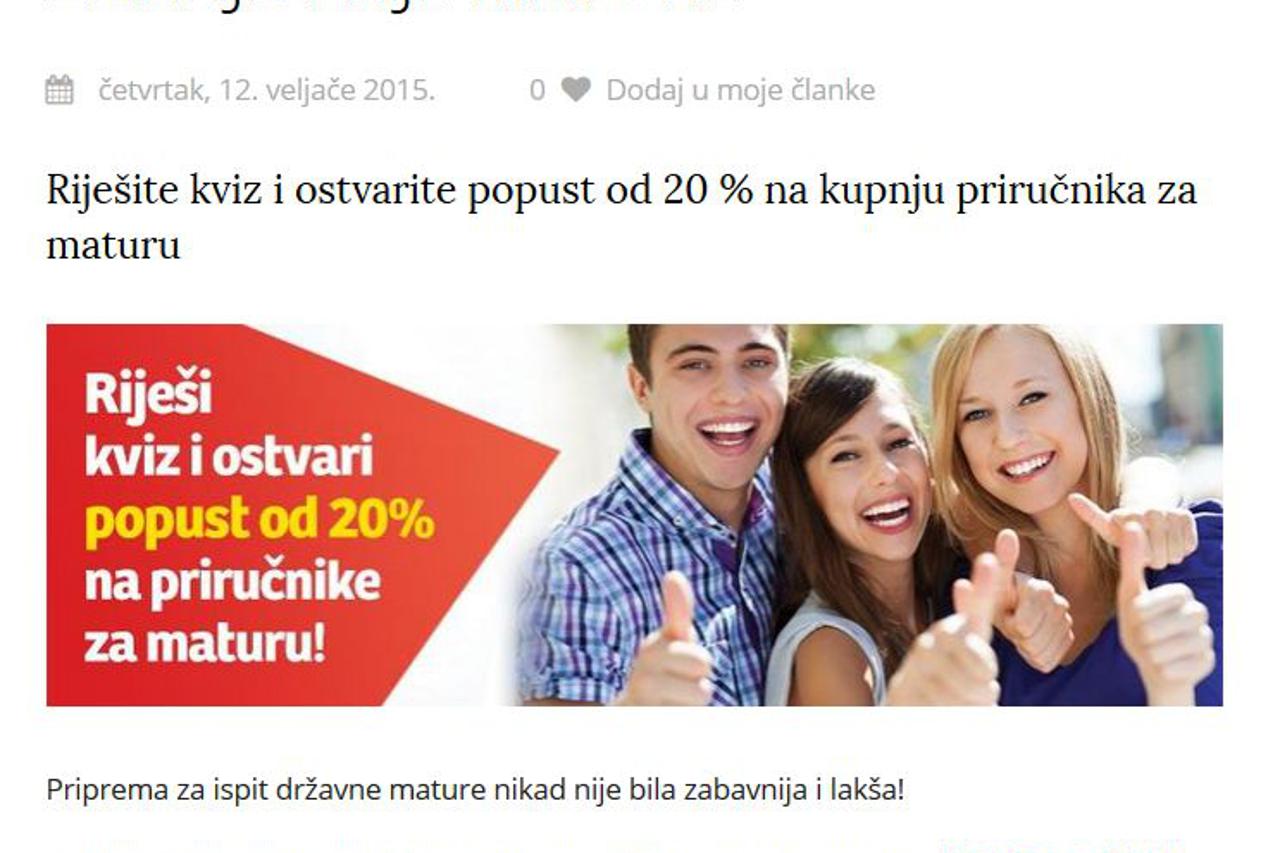 Na Facebooku Kvizom do popusta za priručnik za maturu Mnogima će posebno biti zanimljiv priručnik za hrvatski jezik, a osim njega poslužit će im i dodatna knjižica "Esej za 5...." koji je, pokazalo se, maturantima bio jedan od većih problema na državnoj maturi