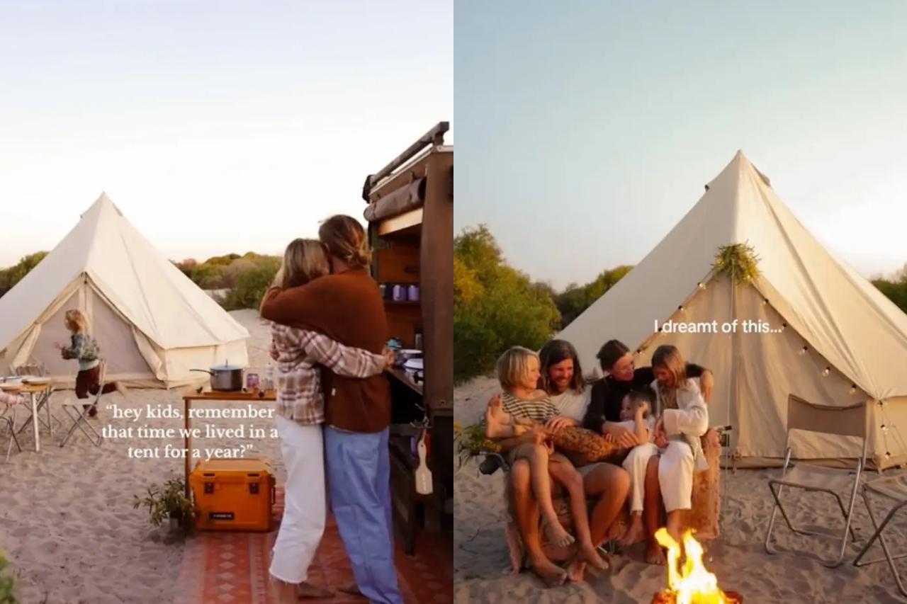 oduševili mnoge Živi u šatoru sa suprugom i troje djece: ‘Jedemo večeru na plaži’ Sa svoje troje djece započeli su svoje putovanje 2018. kada su počeli boraviti u karavanu Spaceline iz 1981. pod nadimkom "Sunny".