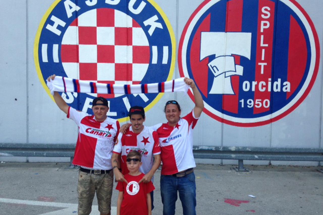 Navedeni trojac je navijač praške Slavije, Hajdukova bratskog kluba pa će večeras dati podršku Splićanima. Česi su stigli u dresovima Slavije, ali sa šalom Hajduka i spremno pozirali ispred grba splitskog kluba