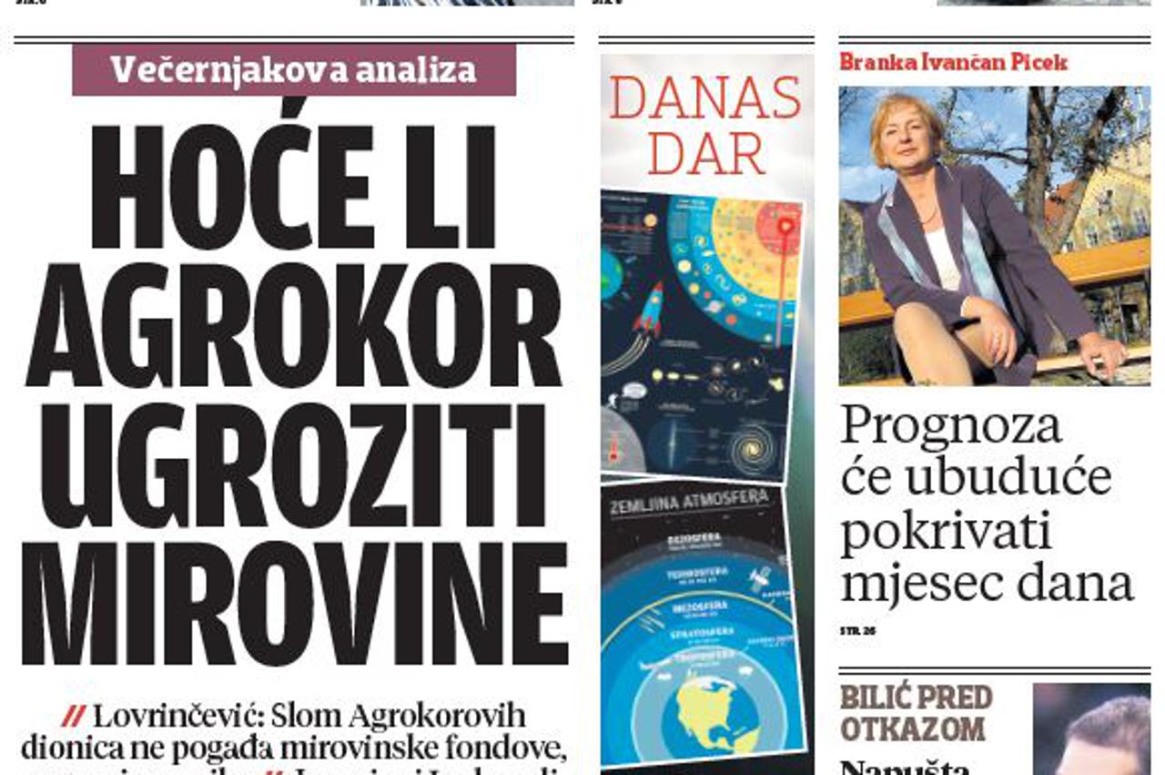 23 DANAS U VEČERNJEM Večernjakova analiza: Hoće li Agrokor ugroziti mirovine? Obvezni mirovinski fondovi izgubili su oko 200 mil. kn na dionicama Leda i Jamnice, ali to je minorno u odnosu na mirovinsku štednju
