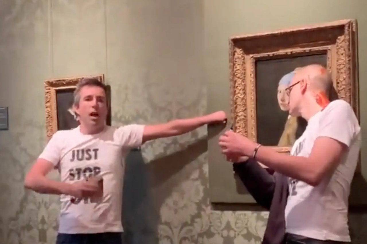 2 klimatski prosvjed Aktivist zalijepio glavu za "Djevojku s bisernom naušnicom" Aktivist skupine Just Stop Oil u četvrtak zalijepio se za Vermeerovo remek-djelo
