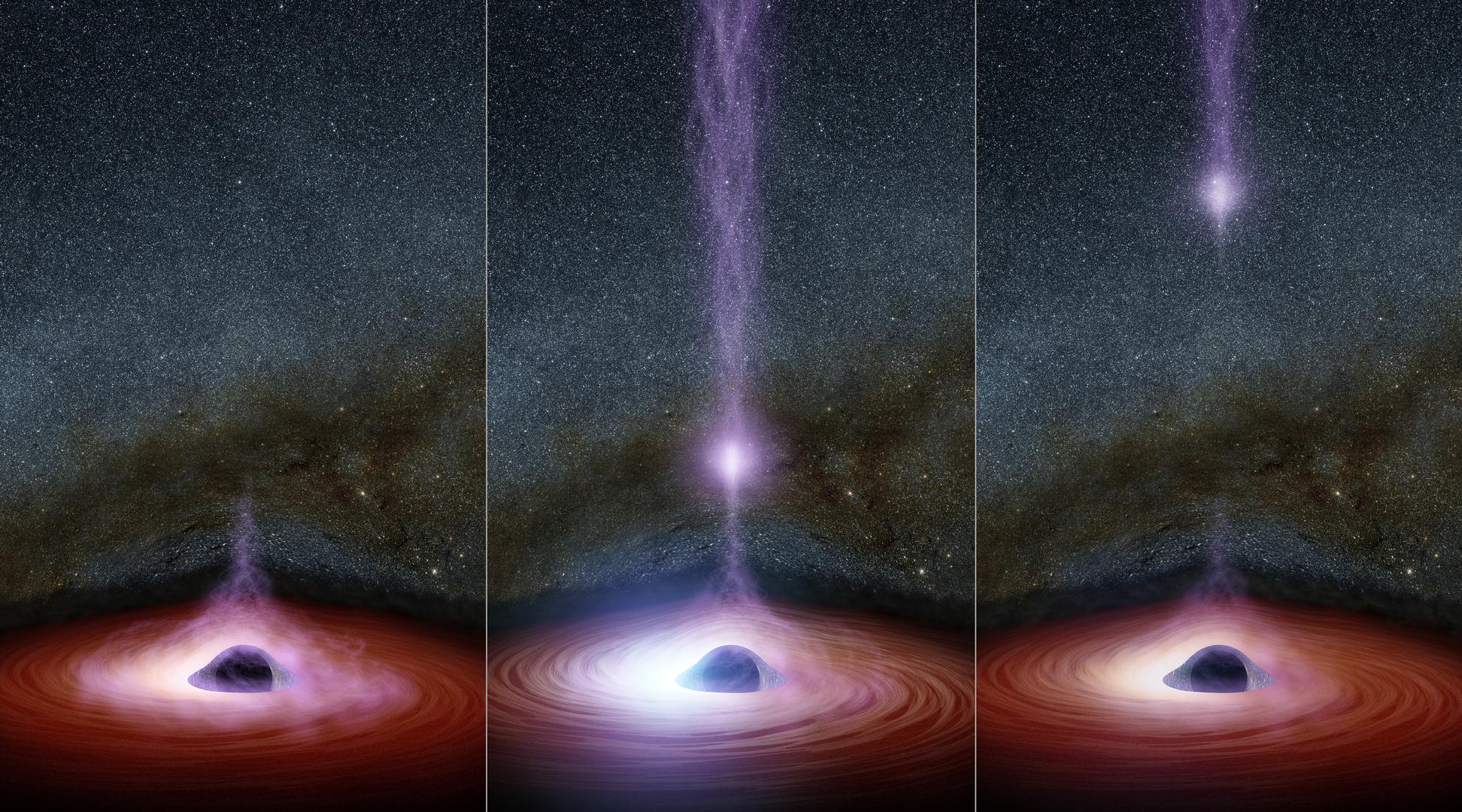 Diagram prikazuje pokretno svojstvo, nazvano korona, kako stvara bljesak rendgenskih zraka oko crne rupe. Korona (ljubičaste boje) skuplja se u sebe, postajući svjetlija, prije nego li se lansira iz crne rupe (sredina i desno). Astronomi ne znaju zašto se korona izmjenjuje, ali saznali su da ova procedura vodi do svijetljenja rendgenskih zraka, koje se može promatrati teleskopom.