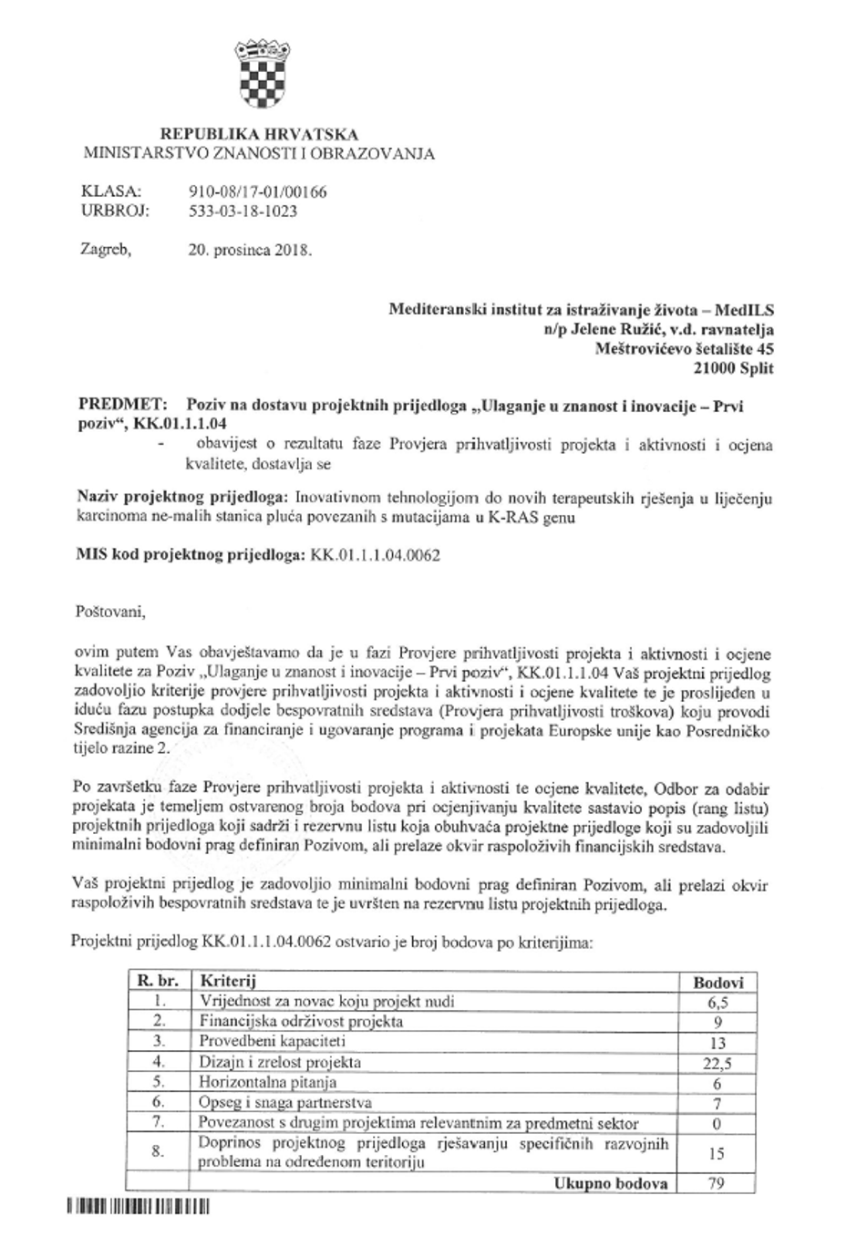 - Naš projekt kojeg smo poslali na evaluaciju u MZO prije 16 mjeseci je prvi u svijetu koji opisuje primjenu naše nove inovativne metode za pronalaženje lijekova protiv najučestalije forme karcinoma pluća ne-malih stanica uzrokovane mutacijama u K-RAS genu, i temelji se na našem nedavnom otkriću tri lijeka protiv slične forme karcinoma pluća ne-malih stanica, ali uzrokovana mutacijama u EGFR genu. Važno je spomenuti da su naša nova tehnologija i ta tri lijeka nedavno opisana u dva odvojena međunarodna patenta- kazao je Štagljar.