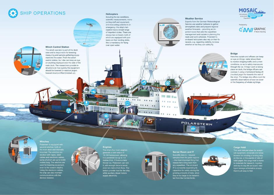 – Najveći smo izvor aerosolnih čestica u okolini i to je problem. No, to je i prilika da razumijemo kako bi dolazak više brodova utjecao na Arktik u budućnosti, rekao je Matthew Shupe iz National Oceanic and Atmospheric Administration Sveučilišta u Coloradu koji je u ekspediciji zadužen za istraživanje atmosfere. “Polarstern” na Arktiku ostaje godinu dana. U jednom razdoblju, dakle, ostat će okovan ledom, a potom će pomalo plutati pored Sjevernog mora i negdje u jesen sljedeće godine izbiti u arhipelag Svalbard kod norveške obale. Ukupno u misiji sudjeluje 300 znanstvenika pa se i zbog toga misija smatra najvećom na Arktiku u povijesti. Normalno, istraživanje se ne provodi samo s broda, već je posada nakon usidrenja odmah uspostavila privremene baze u kojima su tornjevi s različitim instrumentima, privremene nastambe, sve povezano improviziranim uređenim cestama.
