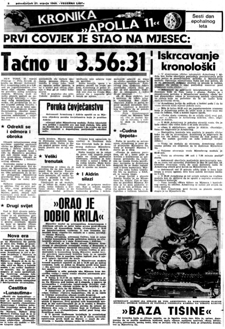 Bilo je to 20. srpnja 1969. godine: Neil Armstrong i Buzz Aldrin uspješno su sletjeli na Mjesečevo tlo, a u orbiti ih je nadgledao i pratio Michael Colins, o čemu je domaća javnost mogla čitati u specijalu od sedam stranica Večernjeg lista, gotovo u realnom vremenu.