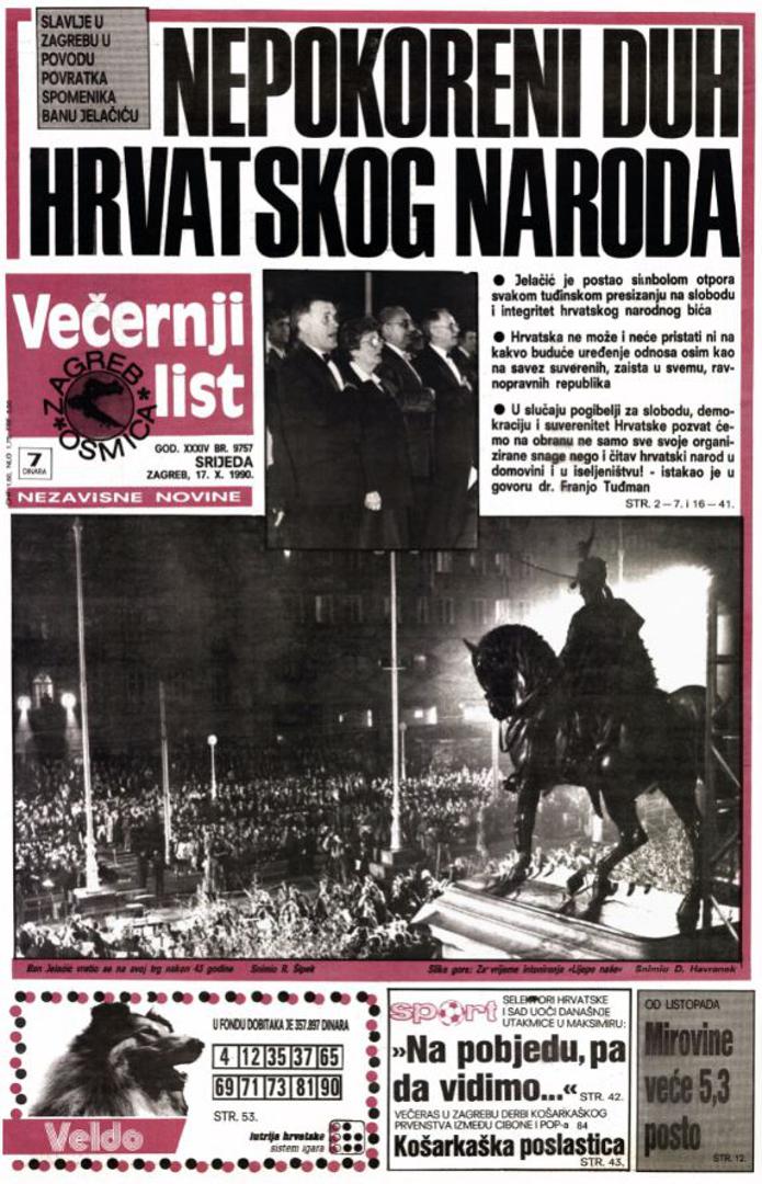 - Prešao sam 850 kilometara kako bih prisustvovao ovom nesvakidašnjem događaju – kazao je našim reporterima Tomislav Jarak koji je doputovao iz Njemačke, jedan od tisuća i tisuća razdraganih Hrvata. Dugo potiskivana želja hrvatskoga naroda u domovini i u svijetu napokon je ispunjena, pišu Večernjakovi novinari. Ban Jelačić vratio se kući.