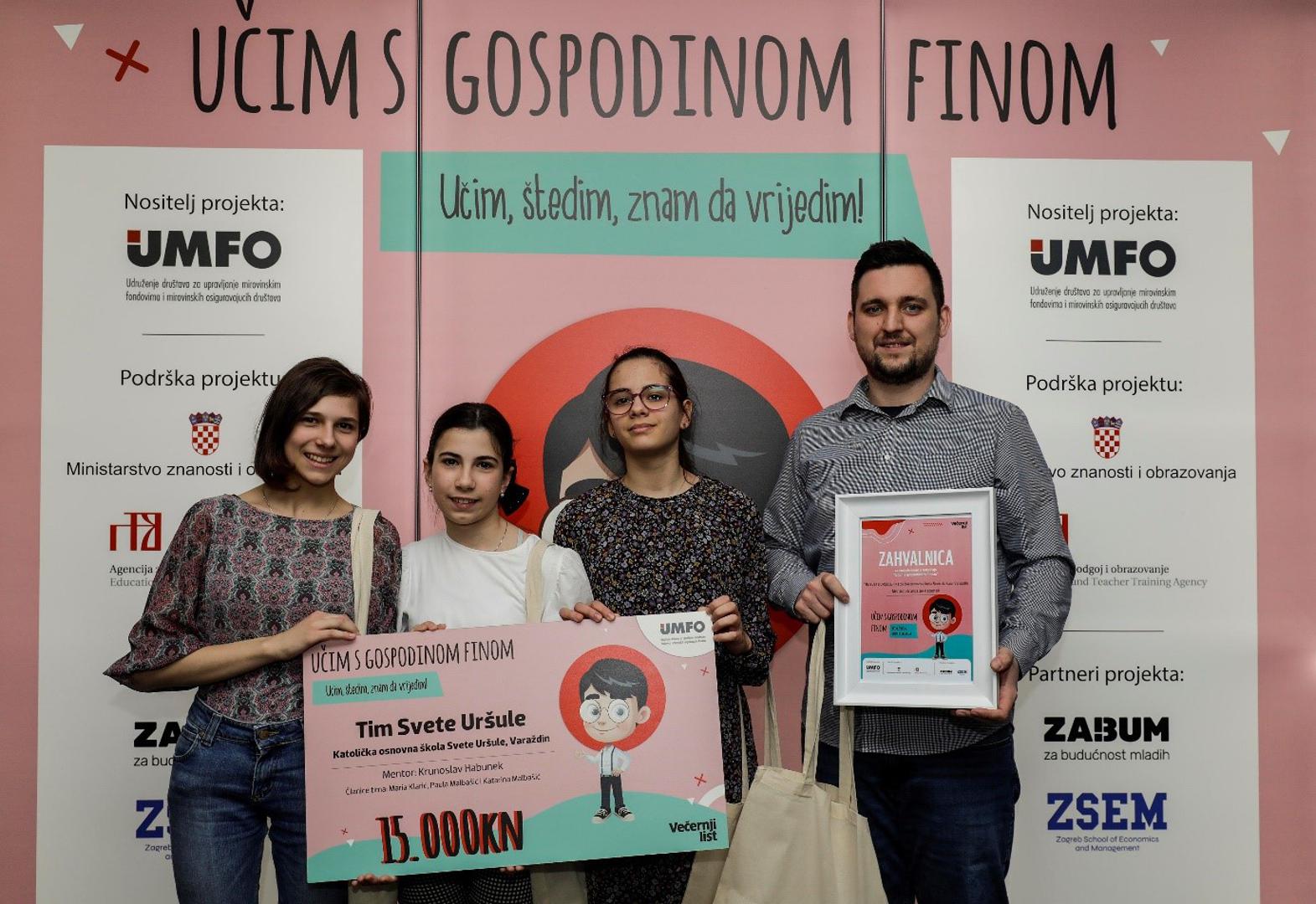 Glavna nagrada odlazi u Varaždin! Iznos od 15.000 kuna dobiva Katolička osnovna škola Svete Uršule, odnosno Tim 1 u sastavu mentora i učenika koji su na najbolji način oživjeli Gospodina Fina, virtualnog financijskog pomoćnika.