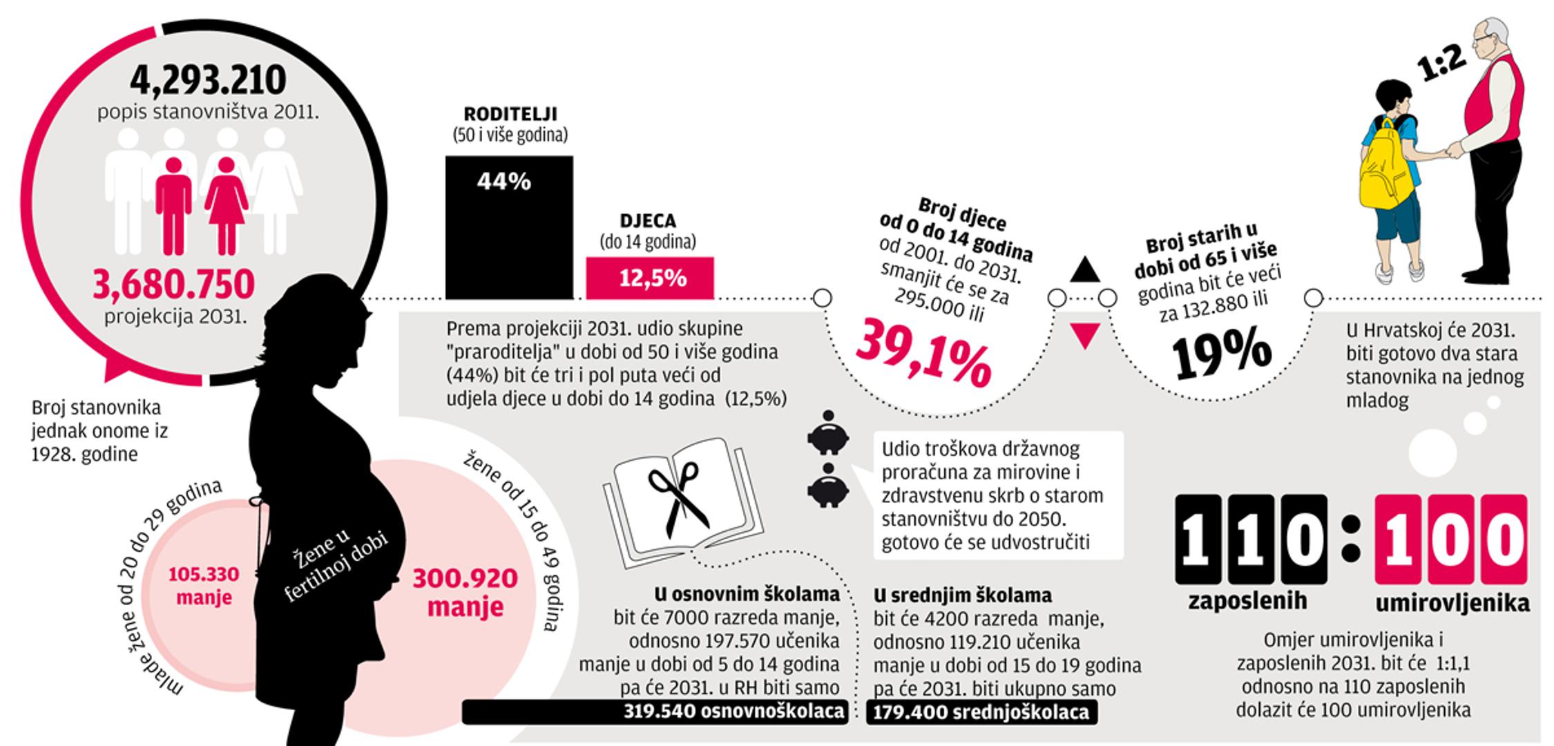 – U sljedećim desetljećima demografsko izumiranje bit će glavno obilježje stanovništva RH. Takva perspektiva ne bi se osjetno promijenila ni da se nekim čudom poveća stopa fertiliteta. Očito će trebati sve manje učitelja i nastavnika. Uslijedit će zatvaranje mnogih škola, posebice u jače depopuliranim krajevima. Prema projekciji broj djece u dobi do 14 godina smanjit će se do 2031. za 197.570, pa će u osnovnim školama biti 7000 razreda manje. Broj srednjoškolaca od 15 do 19 godina smanjit će se do 2031. za 119.210, pa će u srednjim školama biti 4200 razreda manje – navodi Nejašmić. Ističe da će omjer umirovljenika i zaposlenih 2031. će biti 1:1,1 osim ako se značajno ne poveća stopa zaposlenosti.