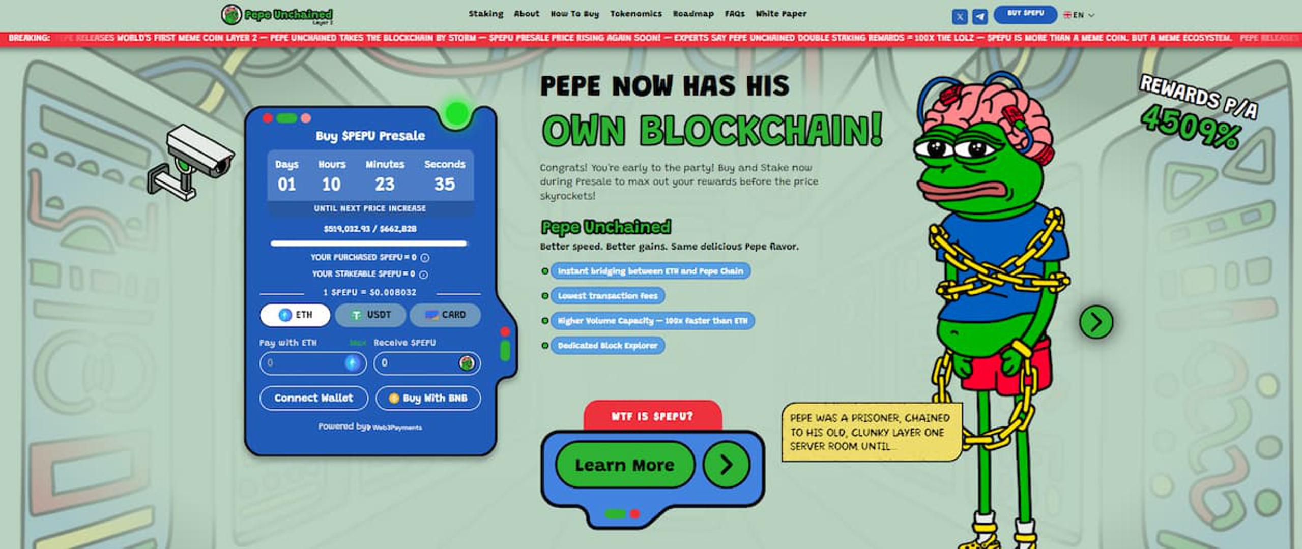 Pepe Unchained prikupio je više od 24 milijuna dolara u pretprodaji svog tokena, čineći ga jednim od najviše hypanih meme kriptovaluta na ICO tržištu u 2024. godini. Tim će lansirati Layer 2 mrežu uz svoj kriptovalutu, obećavajući transakcijske brzine 100x brže od Ethereuma uz samo djelić njegovih gas naknada.