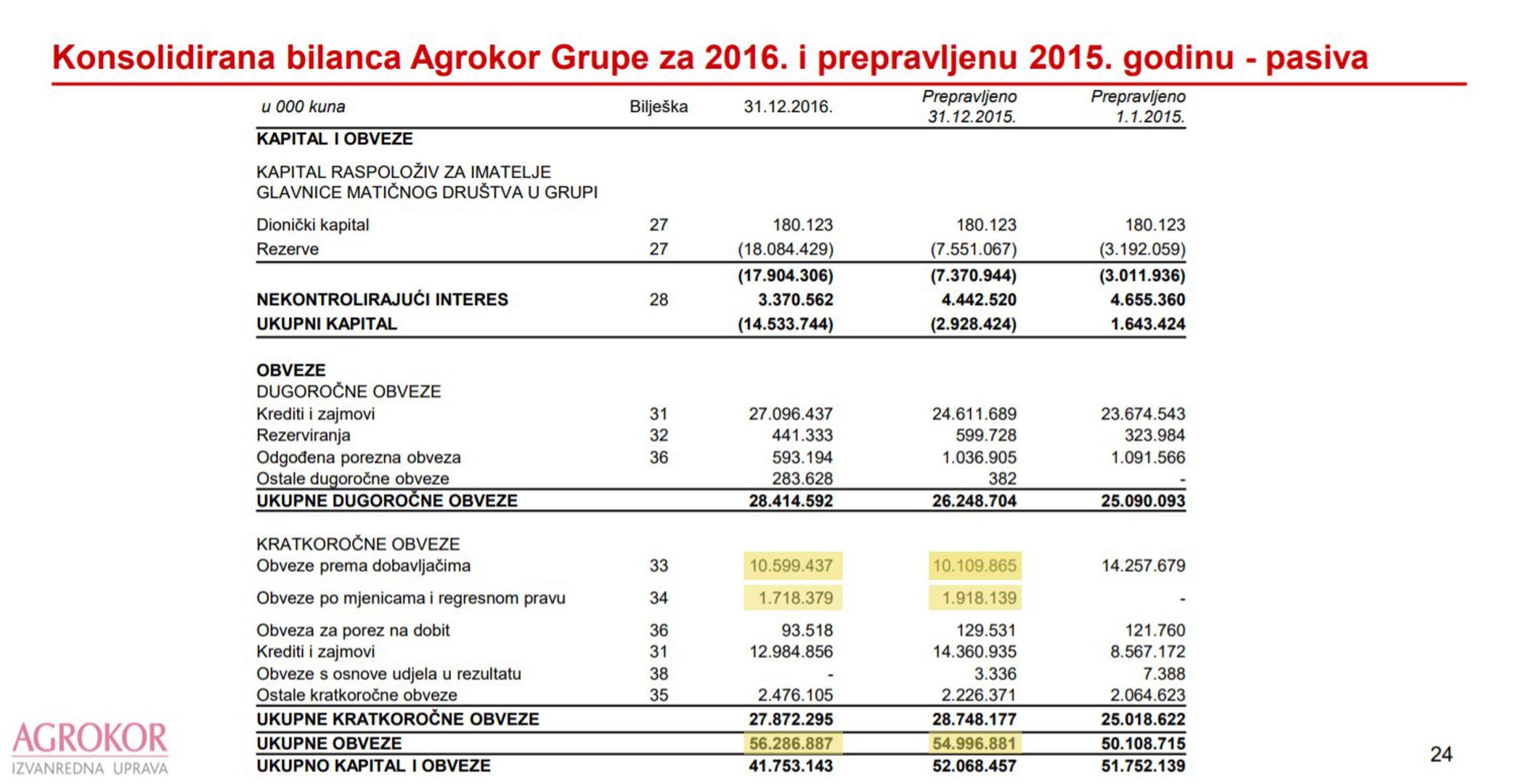 Želim svim dionicima vezanim uz Agrokor, javnosti i svim zainteresiranima, ukazati kako brojke koje je prezentirala izvanredna uprava Agrokora govore sljedeće- da su ukupne obaveze Agrokor grupe u 2016. godini rasle oko 2% u odnosu na 2015. godinu, s time da smo imali investicije od 700.000.000kn. Naše obaveze prema dobavljačima su rasle 2,5% odnosno 300.000.000 kuna.