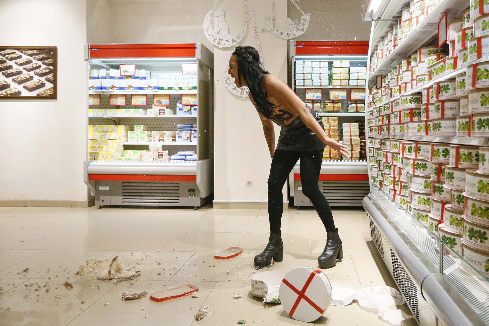 Aktivistica ženske udruge Femen koja se bori za ljudska prava u toplesu je protestirala u trgovini ukrajinske tvornice konditorskih proizvoda Roshen.