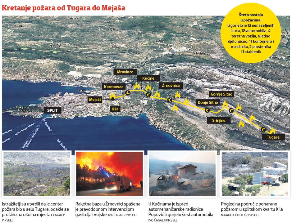 Preliminarno je to izvješće Policijske uprave Splitsko-dalmatinske o razmjerima šteta na imovini građana u požaru na splitskom području. Ministar unutarnjih poslova Davor Božinović na jučerašnjoj je sjednici Vlade izvijestio da je centar požara lociran u selu Tugare, na južnoj padini brda Krčnik uz lokalnu cestu Tugare – Sitno Donje. – Prema mišljenju inspektora zaštite od požara, možemo isključiti mogućnost nastanka požara zbog kvara na dalekovodima. Zaključak bi bio da je uzrok požara otvoreni plamen ili žar – kazao je ministar.