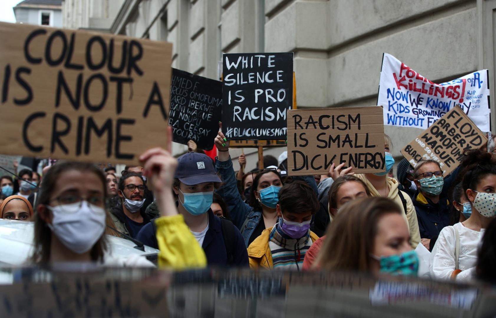 Black Lives Matter protest following the death of George Floyd in Minneapolis police custody, near the U.S. Embassy in Vienna Demonstrators hold signs during a Black Lives Matter protest following the death of George Floyd in Minneapolis police custody, near the U.S. Embassy in Vienna, Austria June 5, 2020. REUTERS/Lisi Niesner LISI NIESNER