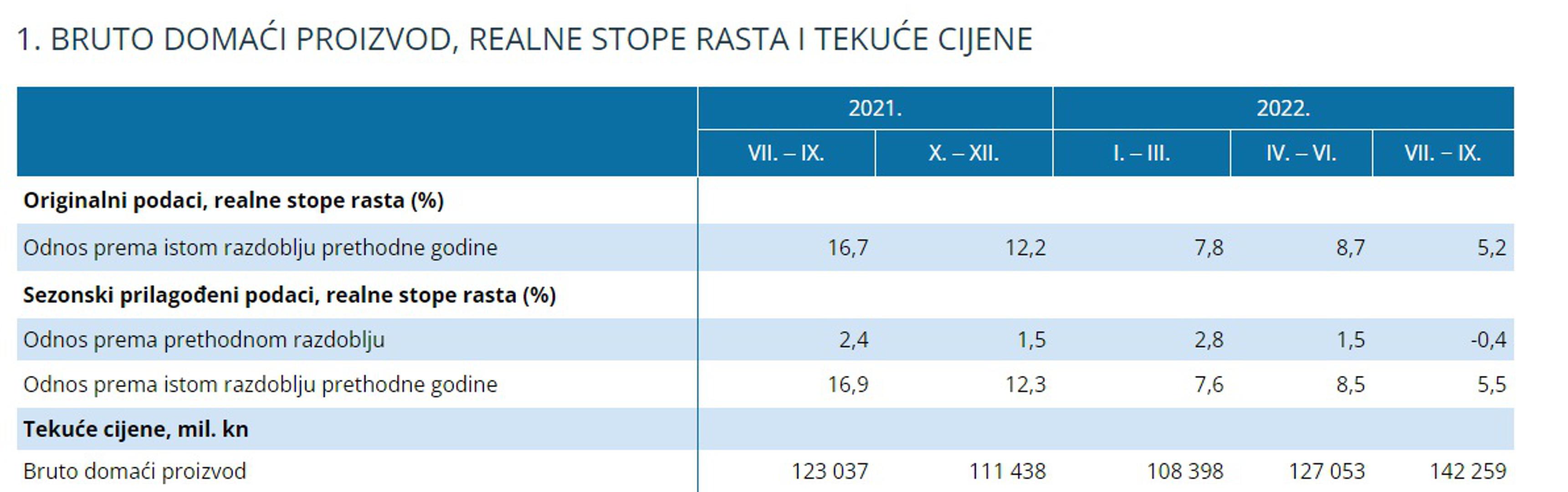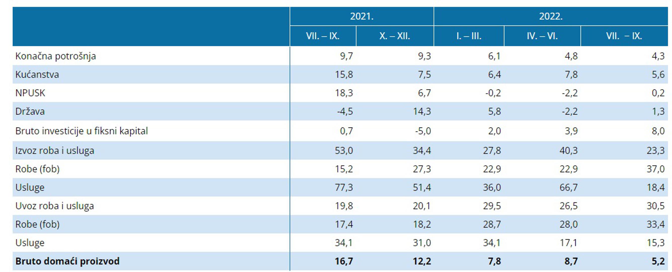 Procjena pokazuje da je tromjesečni BDP u trećem tromjesečju 2022. realno veći za 5,2% u odnosu na isto tromjesečje 2021. https://t.co/huAhZDcrPI pic.twitter.com/5fdHQ3DPhH