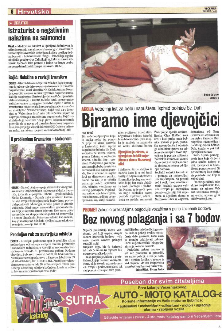 Tužna je sudbina, u svibnju 2003., zadesila i tek rođenu djevojčicu, koja je ostavljena pred zagrebačkom bolnicom. Te prohladne i vjetrovite proljetne noći, jedna je majka, svoje novorođenče, položila na vestu, stavila u kartonsku kutiju te ju je ostavila u žardinjeri za cvijeće, ispred ulaza u bolnicu Sveti Duh. Nešto iza ponoći, umirovljenica, Olga Tkalčec, koja je živjela u kući, nasuprot bolnice, začula je plač bebe.