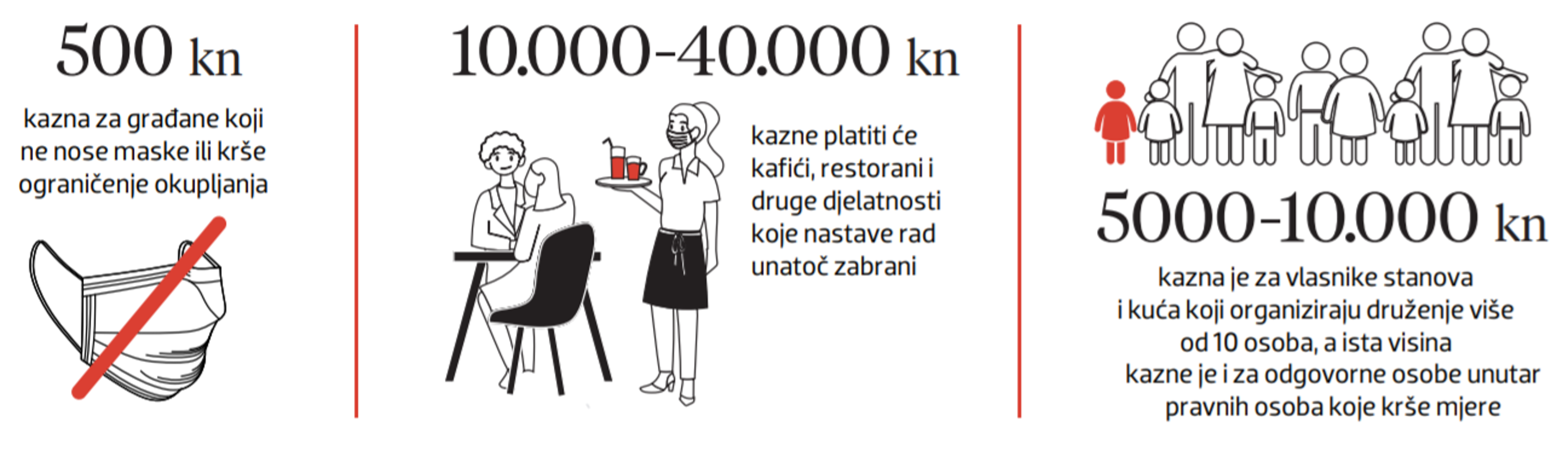 – Nerado idemo u ovom smjeru, ali smatramo da nam je i ovaj alat potreban – rekao je Plenković. U skladu s tom porukom i kazne utvrđene ovim zakonskim izmjenama po iznosima su u donjem dijelu u odnosu na kazne za različite druge prekršaje propisane Prekršajnim i drugim zakonima. Primjerice, za nevezanje pojasa u automobilu građani će platiti 1000 kuna, odnosno 500 ako kaznu plate na licu mjesta, iako tim prekršajem ugrožavaju isključivo vlastitu sigurnost i eventualno interese osiguravatelja. Po zakonskim izmjenama koje je danas donijela Vlada, za građane koji se ne budu pridržavali epidemioloških mjera, primjerice ako ne nose maske tamo gdje su propisane ili ne poštuju propisani razmak i zabranu okupljanja, kazna je 500 kuna. Za pravne osobe, poput kafića, restorana ili teretana, koje budu radile unatoč zabrani zapriječena je kazna u iznosu od 10 do 40 tisuća kuna. Odgovorne osobe unutar pravnih plaćat će kazne od pet do 10 tisuća kuna ako se tvrtke kojima upravljaju ne budu držale mjera, a jednaka kazna prijeti i vlasnicima kuća i stanova koji organiziraju okupljanje više od 10 osoba.