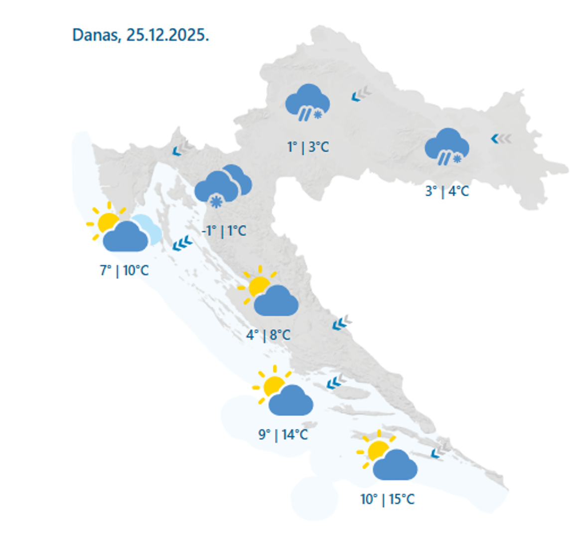 Pred Hrvatskom su hladni i uglavnom nestabilni blagdanski dani, uz izraženije zimske uvjete u unutrašnjosti te jaku buru i sunčanija razdoblja uz obalu. Prema prognozi Državnog hidrometeorološkog zavoda, vrijeme će biti vrlo raznoliko, ovisno o regiji. U unutrašnjosti zemlje prevladavat će pretežno oblačno vrijeme, mjestimice uz kišu i susnježicu, dok se u višim predjelima očekuje i snijeg. Najviše dnevne temperature kretat će se između -1 i 4 °C. Puhat će slab do umjeren sjeveroistočni vjetar, dok će na istoku zemlje povremeno jačati istočnjak.