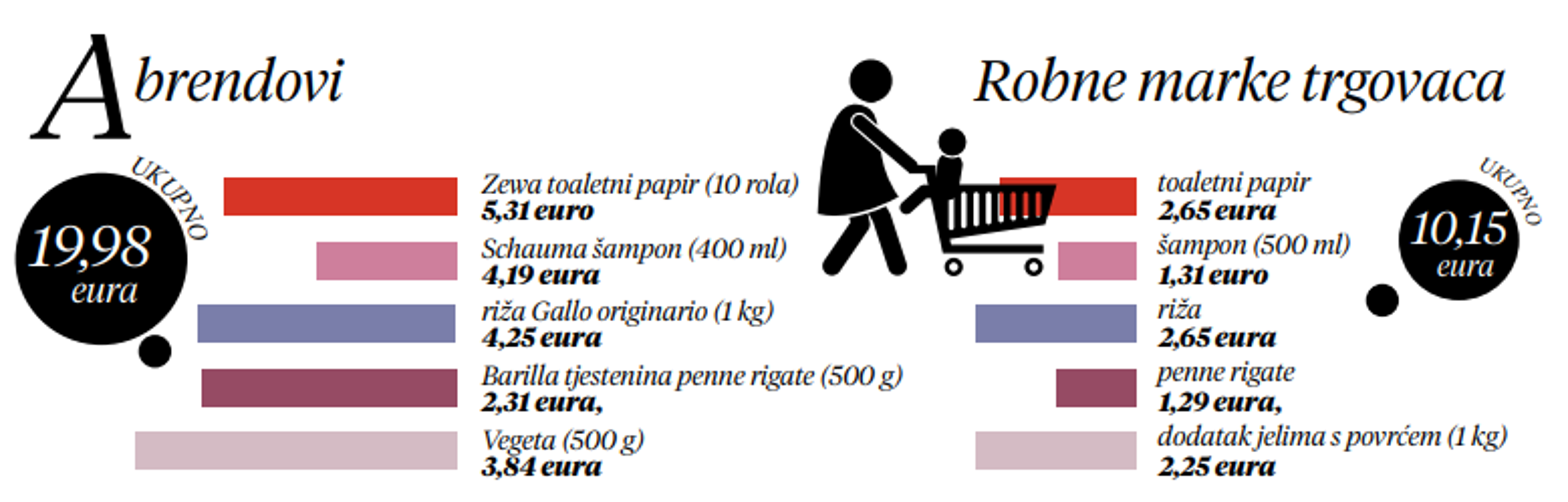 Samo na pet artikala u potrošačkoj košarici, ovisno jesmo li i dalje vjerni tzv. A-brendovima ili nam je dobra i trgovačka robna marka, može se uštedjeti gotovo dvostruko, pokazala je Večernjakova kratka inspekcija u nekima od vodećih trgovačkih lanaca. U prvoj košarici našlo se 10 rola Zewa troslojnog toaletnog papira, šampon Schauma (400 ml), riža Gallo originario (1 kg), Barilline Penne rigate (500 g) te Vegeta (500 g) koje smo platili ukupno 19,98 eura ili 150,54 nekadašnjih kuna. Druga – skromnija, s istovrsnim proizvodima dobro znanih trgovačkih robnih marki Konzuma, Spara, Lidla i dm-a – koštala nas je pak 10,15 eura (76,48 kn), s time da smo već sa šamponom koji je bio jeftiniji 2,88 eura, a sadržavao je 100 ml više, te s dodatkom jelima s povrćem kojega je u pakiranju čitav kilogram, a koštao je 1,59 eura manje, uštedjeli 4,47 eura ili 33,68 kuna.
