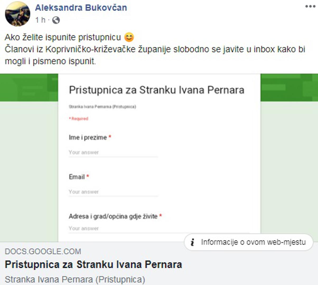 - Ako želite ispunite pristupnicu. Članovi iz Koprivničko-križevačke županije slobodno se javite u inbox kako bi mogli i pismeno ispuniti - napisala je Aleksandra.