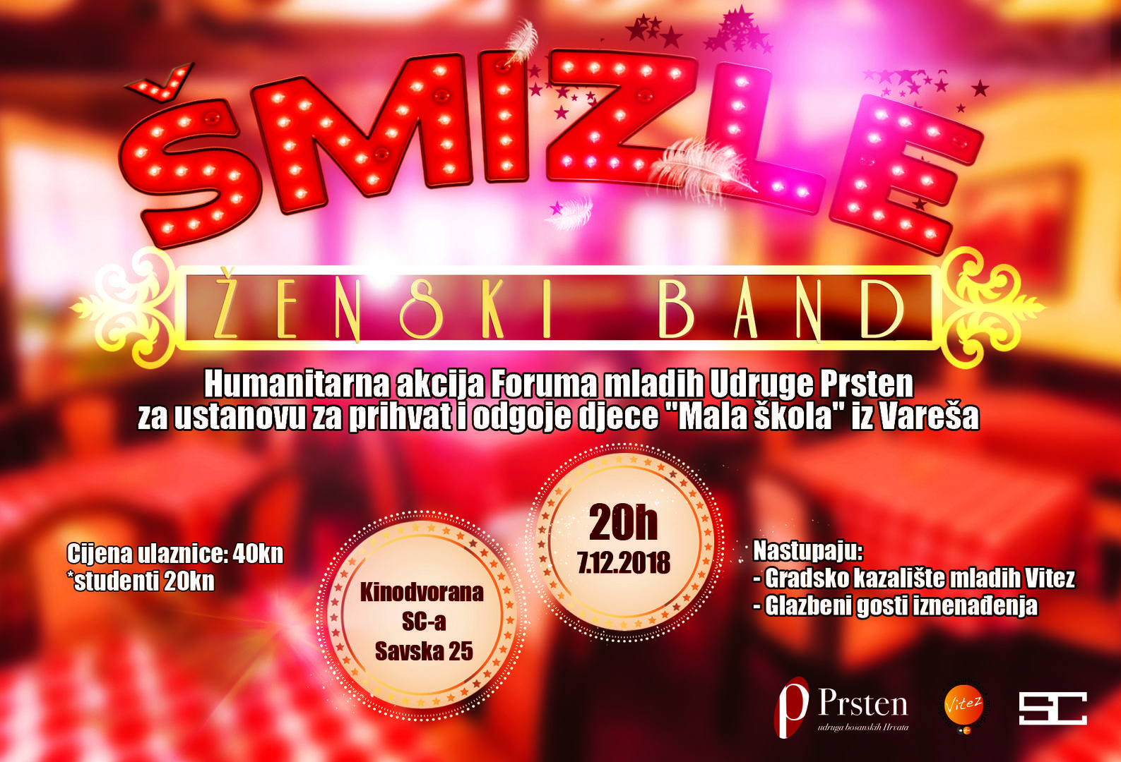Desetu godinu uzastopno Forum mladih prikuplja sredstva organizacijom humanitarne kazališne predstave, a ove godine Predstava „Šmizle“ u izvedbi Gradskog kazališta mladih Vitez održat će se u petak, 7. prosinca 2018. godine u 20:00 sati u kinodvorani Studentskog centra Zagreb, Savska cesta 25. Neposredno prije predstave nastupit će i glazbeni gosti iznenađenja koji će izvesti nekoliko prigodnih pjesama prije i poslije predstave. Prikupljena sredstva bit će iskorištena za dolazak devetnaestero djece iz ustanove „Mala škola“ iz Vareša, prihvatne zajednice za djecu s teškim osobnim i obiteljskim situacijama na advent u Zagreb tijekom kojeg će djeca imati prilike obići sve važnije znamenitosti glavnog grada Hrvatske.