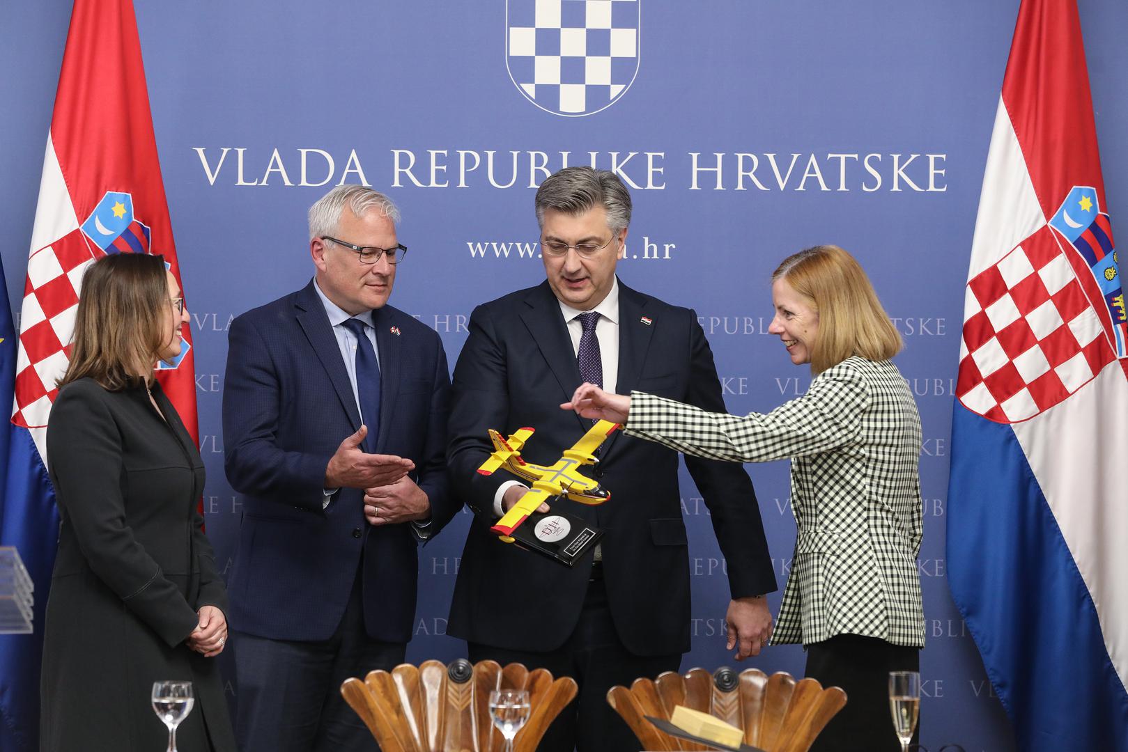 Ugovor je potpisan u Banskim dvorima, u prisutnosti premijera Andreja Plenkovića koji je naglasio kako je Hrvatska jedna od desetak zemalje koje trenutno imaju kanadere u svojoj floti. "Broj narudžbi europskih zemalja toliko je bio velik da se kompaniji De Havilland isplatilo pokrenuti novu proizvodnju", rekao je premijer.
