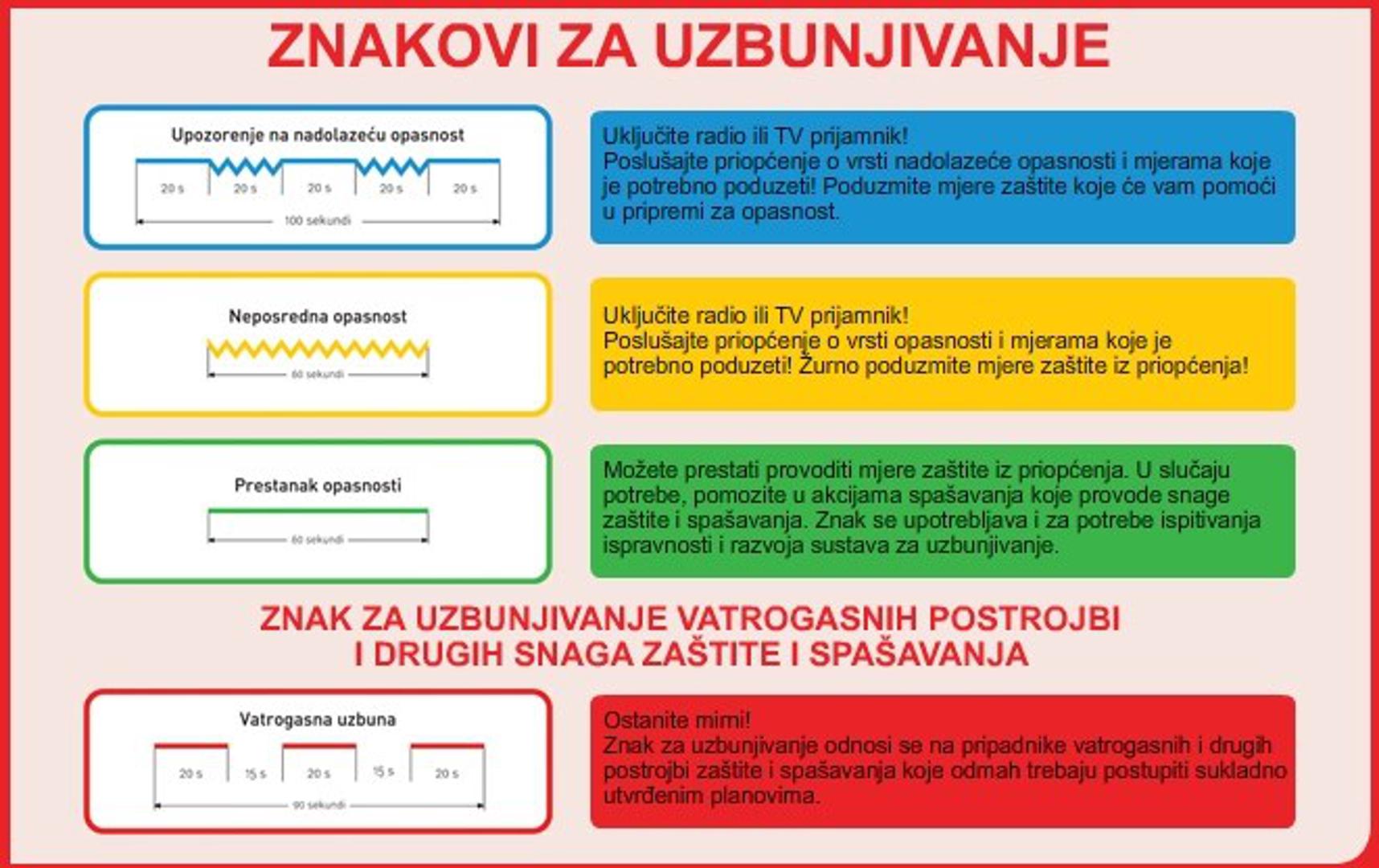 - Redovno ispitivanje ispravnosti sustava javnog uzbunjivanja provodi se svake prve subote u mjesecu u 12:00 sati oglašavanjem znaka "prestanak opasnosti“, čime se kontrolira funkcionalnost sustava javnog uzbunjivanja, a ujedno uvježbava rukovanje sustavom i provjerava djelotvornosti protokola potpisanih s elektroničkim medijima - navodi Civilna zaštita.