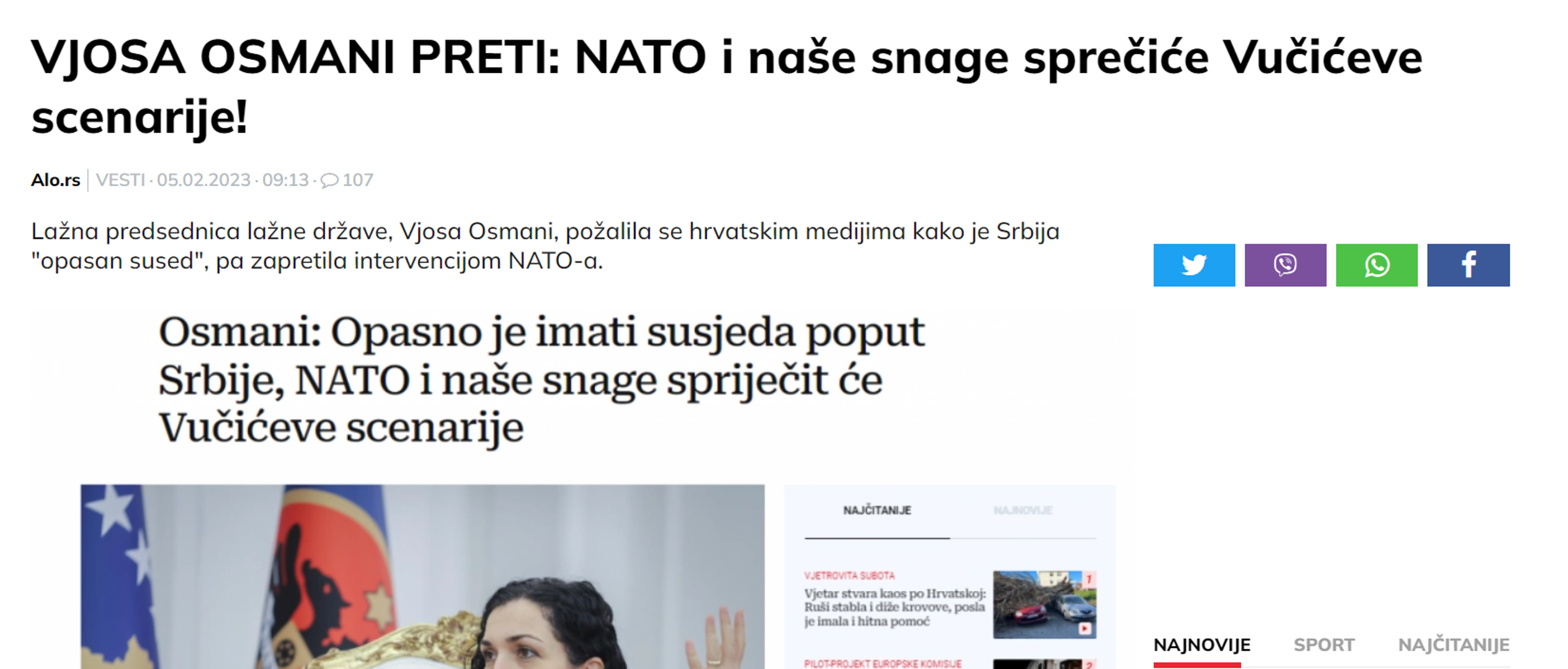 ''Maltretiraju, prebijaju i pucaju na srpsku djecu, a sada i prijete Vučiću. Lažni srpski patrioti, Hrvati i Šiptari, pušu u istu tikvu, svima im je predsjednik Vučić trn u oku jer znaju da neće izdati ni državu ni narod'' stoji u tekstu kojeg je Alo! objavio pod naslovom: ''Vjosa Osmani prijeti: NATO i naše snage spriječit će Vučićeve scenarije!''.