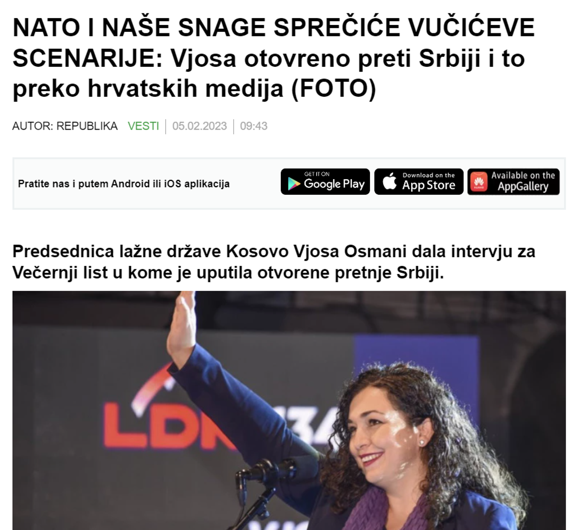 Večernji list ekskluzivno je objavio intervju s kosovskom predsjednicom Vjosom Osmani u kojem se dotaknula stanja u svojoj zemlji, pregovorima sa Srbijom te provokacijama Aleksandra Vučića zašto se protivi osnivanju zajednice srpskih općina na sjeveru Kosova. Osim toga, napomenula je i kako je ''opasno imati susjeda poput Srbije, zbog čega Kosovo i NATO rade na sprječavanju određenih scenarija''. Ova se izjava nikako nije svidjela pojedinim srpskim medijima koji su tu izjavu shvatili kao prijetnju.