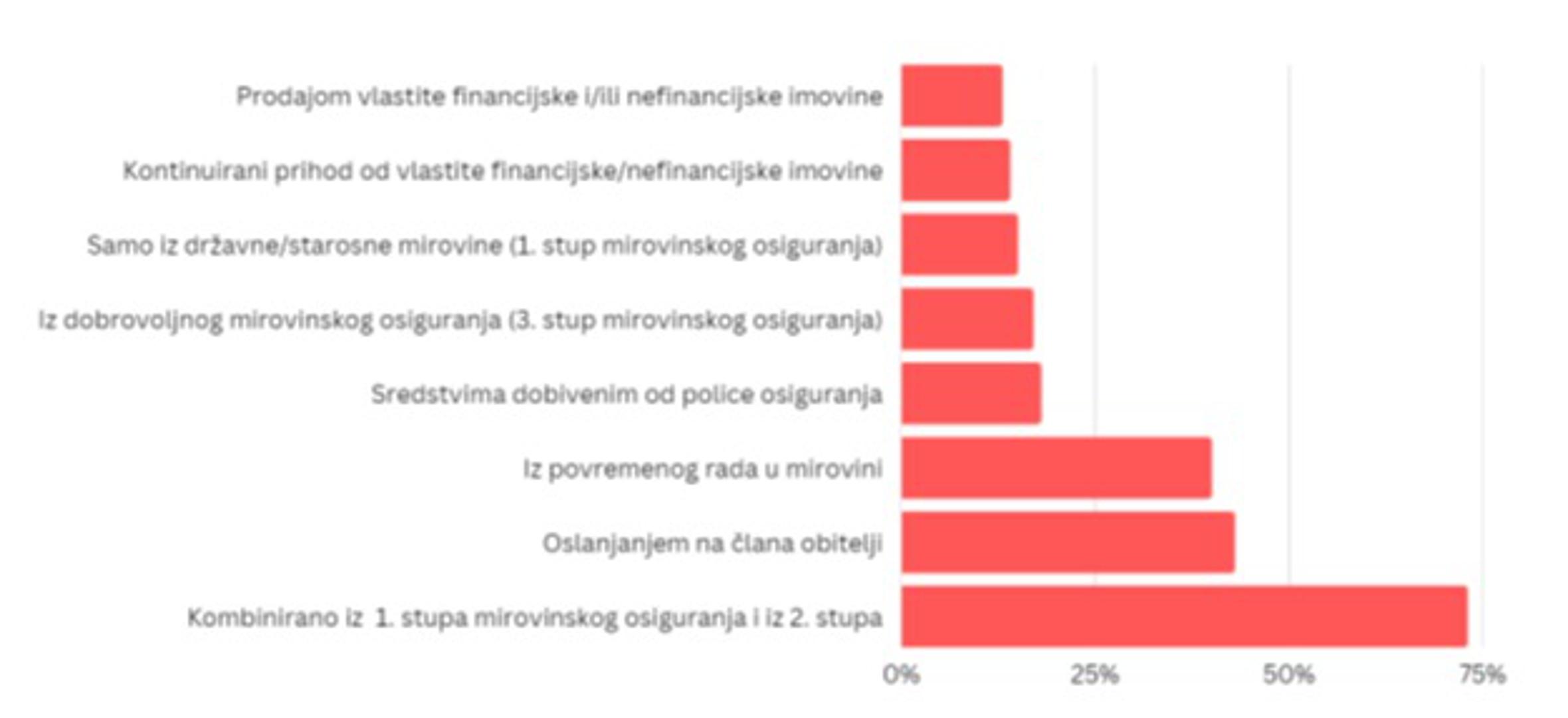 Istraživanje je pokazalo i da je čak trećina ispitanika (35 posto) u dobi od 50 do 65 godina umirovljena, a više od polovine ih je otišlo u prijevremenu starosnu mirovinu. Tek manji dio ispitanika u mirovni ostvaruje neki prihod i izvan sustava obaveznog mirovinskog osiguranja, u okviru kojeg mirovinu ostvaruje 91 posto svih umirovljenika. Dodatni izvori prihoda uglavnom se ostvaruju kroz daljnji rad tijekom mirovine (24 posto), dok je oslanjanje na dobrovoljnu mirovinsku štednju (pet posto) bitno manje zastupljeno. Tek se pet posto osoba u mirovini oslanja na stalni prihod od financijske ili nefinancijske imovine, a dodatnih pet posto na povremeni prihod od njihove prodaje. No unatoč tim više ili manje dostupnim mogućnostima za dopunu primanja iz obveznog mirovinskog sustava gotovo 41 posto ispitanika u mirovini se mora financijski dodatno oslanjati na svoju obitelj.